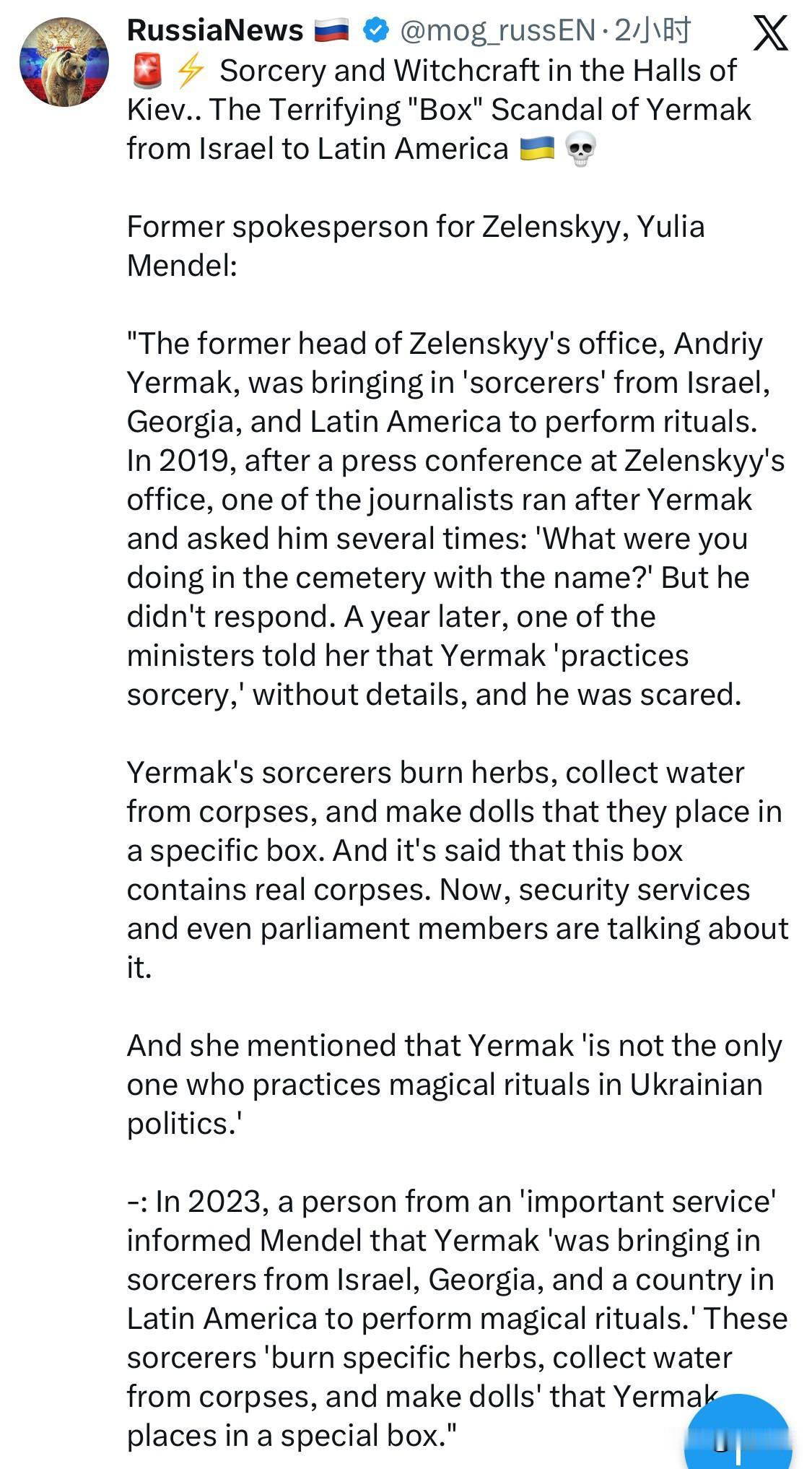 乌克兰基辅宫廷中的巫术与魔法……从以色列到拉丁美洲的耶尔马克恐怖“盒子”丑闻。 尤利娅·门德尔(Iuliia Mendel)是乌克兰资深记者和政治顾问,曾于2019年6月至2021年7月担任乌克兰总统泽连斯基的新闻发言人,她透露了一些这方面的信息: “泽连斯基办公室前主任安德烈·叶尔马克从以色列、格鲁吉亚和拉丁美洲请来‘巫师’举行仪式。 2019年,在泽连斯基办公室举行的新闻发布会结束后,一名记者追上叶尔马克,反复追问他:“你拿着那个名字在墓地干什么?”但他没有回答。一年后,一位部长告诉她,叶尔马克“会巫术”,但没有透露更多细节,她感到害怕。 耶尔马克镇的巫师们焚烧草药,从尸体中收集水,制作人偶,然后把人偶放在一个特定的盒子里。据说这个盒子里装的是真正的尸体。现在,连安全部门和议员们都在谈论这件事。 她还提到,叶尔马克“并不是乌克兰政坛上唯一一个搞巫术仪式的人”。 2023年,一位来自“重要部门”的人士告知门德尔,耶尔马克“正在从以色列、格鲁吉亚和拉丁美洲的一个国家请来巫师进行魔法仪式”。这些巫师“焚烧特定的草药,从尸体上收集水,并制作玩偶”,耶尔马克将这些玩偶放在一个特殊的盒子里。