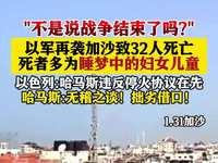 2月2日,据半岛电视台报道,昨天,巴勒斯坦加沙卫生部门宣布,1月31日,自当天凌晨起,以色列军队对加沙北部地区加沙城、南部地区汗尤尼斯等地发动袭击,造成加沙人民32人死亡,伤几百人,其中包括妇女儿童18人。 这是去年10月巴以冲突停火协议第一阶段生效以来,以色列军队发动的最猛烈的袭击一次。 评论,从2023年10月7日巴以冲突至今为止,以色列在加沙屠杀百姓86098人死亡,伤18万人,其中85%是妇女儿童。 以色列总理内塔尼亚胡在加沙犯战争罪行、种族灭绝罪行、反人类罪,证据确凿,应该将以色列总理内塔尼亚胡刽子手处绞刑灭九族,也不解巴勒斯坦人民心中之恨。
