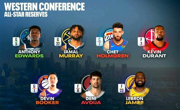 西部全明星替补阵容完整如下:詹姆斯,杜兰特,爱德华兹,贾马尔-穆雷霍姆格伦,布克