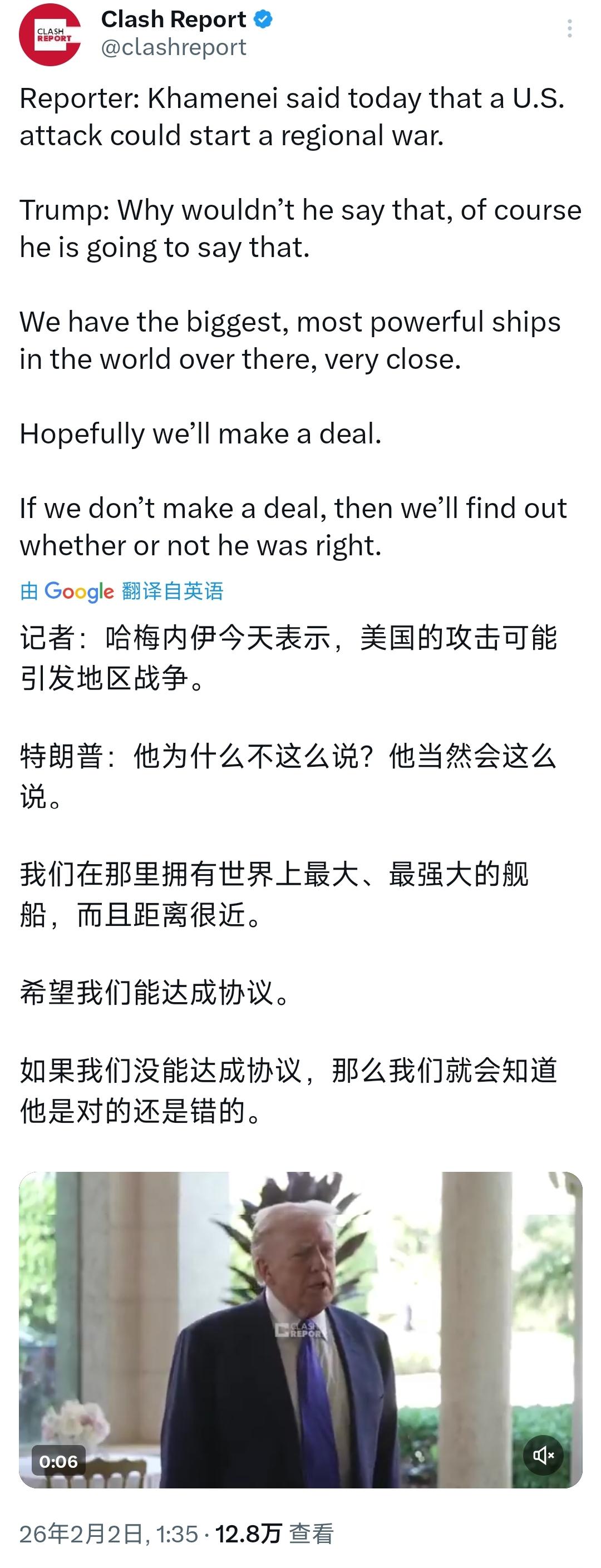 特朗普今天(北京时间2月2日)在白宫接受采访的一幕。 记者:哈梅内伊今天表示,美国的攻击可能引发地区战争。 特朗普:他为什么不这么说?他当然会这么说。我们在那里拥有世界上最大,最强大的舰船,而且距离很近。希望我们能达成协议。如果我们没能达成协议,那么我们就会知道他是对的还是错的。 [机智]评几句:特朗普的表态满是霸权嚣张气焰与强盗逻辑思维,一边拿“世界最大最强舰船就近威慑”亮肌肉,靠极限施压逼伊朗松口,一边蓄意提“希望达成协议”,把地区战和的主动权都全部攥在自己手里。伊朗的态度松动,不过是美军大兵压境,以及扛不住长期制裁的现实妥协。眼下看似有谈判苗头,但是美方没打算真松绑制裁,伊方也不会放弃核权益底线,周边国家立场各异、多方势力暗流涌动,即便伊朗暂露软态,地区局势依旧扑朔迷离,战云未散,稍有不慎就可能引爆全面冲突,后续走向仍藏无数变数。