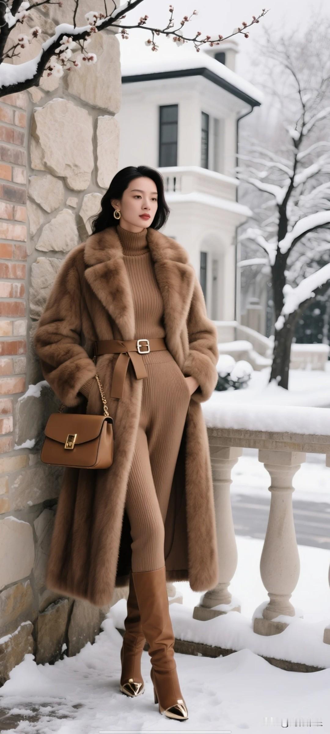 白雪皑皑,咖啡色的穿搭,算不算是优雅啊?