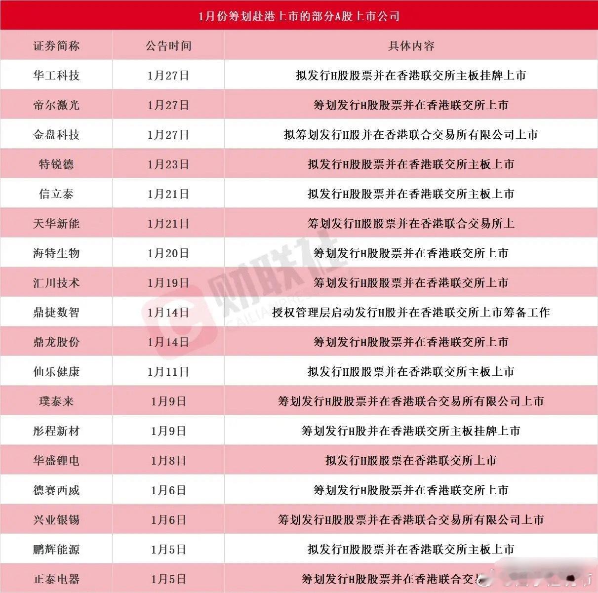最新筹划赴港上市公司梳理!1月多家A股细分龙头集中筹划赴港上市,覆盖新能源、高端制造、医药生物等高景气赛道,核心诉求是拓宽融资、吸引国际资本、加速全球化布局。短期事件催化明显,需关注港股发行节奏与估值扰动,中长期取决于融资后的业务拓展成效。个股梳理分析1. 华工科技:国内激光装备与光通信核心企业,拟赴港上市融资加码高端制造与光通信业务,适配AI算力与新能源需求。短期获事件催化,需关注港股发行估值与资金分流,中长期看业务协同与订单增长。2. 帝尔激光:光伏激光设备龙头,拟赴港上市融资加码高效电池技术研发与产能扩张,受益于光伏装机需求增长。短期情绪催化明确,需关注港股估值与行业周期波动,中长期看技术迭代与订单兑现。3. 金盘科技:新能源电力设备核心企业,拟赴港上市融资加码储能与特高压设备研发,适配新型电力系统需求。短期获事件催化,需关注港股发行节奏与行业政策,中长期看业务扩张与业绩弹性。4. 特锐德:电力设备与充电桩龙头,拟赴港上市融资加码充电桩网络与储能业务布局,受益于新能源车渗透率提升。短期情绪催化明显,需关注港股估值与行业竞争,中长期看业务协同与盈利改善。5. 信立泰:创新药与医疗器械龙头,拟赴港上市融资加码创新药研发与国际化临床推进,适配全球医药需求。短期获事件催化,需关注港股医药估值与研发进度,中长期看新药获批与业绩增长。6. 天华新能:锂电材料核心企业,拟赴港上市融资加码锂盐产能扩张与技术升级,受益于新能源车需求增长。短期情绪催化明确,需关注港股估值与锂价周期波动,中长期看产能释放与业绩弹性。7. 海特生物:医药生物核心企业,拟赴港上市融资加码创新药与CRO业务布局,适配全球医药研发需求。短期获事件催化,需关注港股医药估值与研发进展,中长期看新药商业化与订单增长。8. 汇川技术:工业自动化与新能源车核心企业,拟赴港上市融资加码伺服系统与电控技术研发,适配高端制造需求。短期情绪催化明显,需关注港股估值与行业竞争,中长期看业务扩张与业绩确定性。9. 鼎捷数智:工业软件与智能制造服务商,拟赴港上市融资加码AI+工业软件研发与生态建设,适配数字经济需求。短期获事件催化,需关注港股科技股估值与行业政策,中长期看生态布局与订单增长。10. 鼎龙股份:半导体与锂电材料龙头,拟赴港上市融资加码CMP抛光垫与锂电分散剂研发,适配国产替代需求。短期情绪催化明确,需关注港股估值与行业周期波动,中长期看产能释放与业绩弹性。11. 仙乐健康:营养保健品龙头,拟赴港上市融资加码产品研发与海外渠道拓展,适配全球健康消费需求。短期获事件催化,需关注港股消费股估值与海外竞争,中长期看渠道扩张与业绩增长。12. 璞泰来:锂电材料龙头,拟赴港上市融资加码负极材料与涂覆设备产能扩张,受益于新能源车需求增长。短期情绪催化明显,需关注港股估值与锂价周期波动,中长期看产能释放与业绩确定性。13. 彤程新材:新材料与半导体材料龙头,拟赴港上市融资加码光刻胶与电子材料研发,适配国产替代需求。短期获事件催化,需关注港股科技股估值与研发进度,中长期看产品放量与业绩增长。14. 华盛锂电:锂电电解液核心企业,拟赴港上市融资加码产能扩张与技术升级,受益于新能源车需求增长。短期情绪催化明确,需关注港股估值与行业竞争,中长期看产能释放与业绩弹性。15. 德赛西威:智能驾驶与汽车电子龙头,拟赴港上市融资加码自动驾驶与智能座舱研发,适配新能源车需求。短期情绪催化明显,需关注港股估值与行业竞争,中长期看技术迭代与订单增长。16. 兴业银锡:锡资源龙头,拟赴港上市融资加码锡矿开发与产能扩张,受益于锡价上涨与光伏焊带需求。短期获事件催化,需关注港股资源股估值与锡价波动,中长期看产能释放与业绩弹性。17. 鹏辉能源:锂电与储能龙头,拟赴港上市融资加码储能技术研发与产能扩张,受益于新型电力系统需求。短期情绪催化明确,需关注港股估值与行业竞争,中长期看业务扩张与业绩增长。18. 正泰电器:电力设备与光伏龙头,拟赴港上市融资加码光伏组件与储能业务布局,受益于新能源政策催化。短期获事件催化,需关注港股估值与行业周期波动,中长期看业务协同与业绩确定性。总结本次赴港上市标的多为细分领域龙头,核心诉求是拓宽融资、吸引国际资本、加速全球化布局。短期事件催化明显,但需关注港股发行节奏、估值定价及流动性对A股股价的扰动;中长期则取决于融资后的业务拓展成效,建议优先选择技术壁垒高、订单确定性强的标的,规避短期情绪炒作风险。本文涉及资讯、数据等内容来自网络公共信息,仅供参考,不构成投资建议!