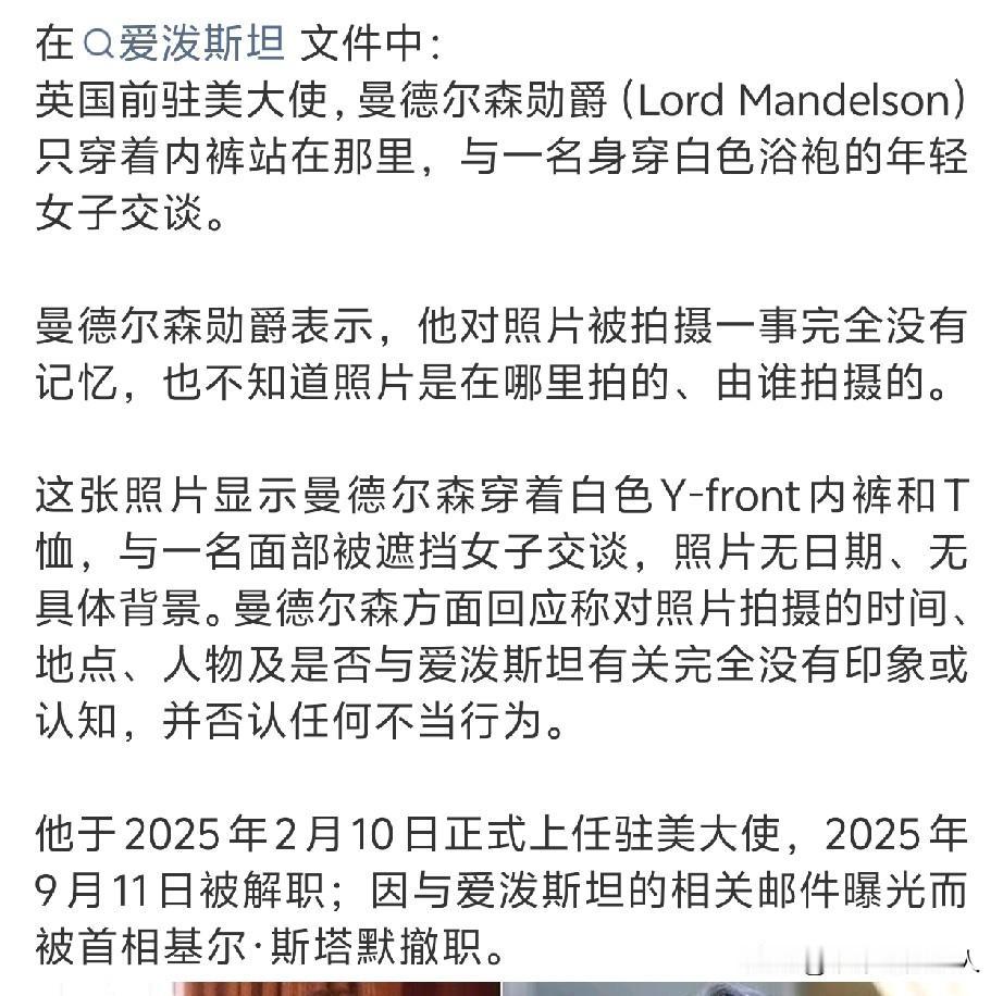 擦!英国人也好这一口?你看有媒体报道,英国驻美大使也卷入了爱泼斯坦案。我就奇了怪了这照片是怎么拍出来的?是专门有人拍照片吗?这也不像是p的图啊。你看就连这个前驻美大师曼德尔森勋爵,他都很奇怪,他也不记得有这么回事,看来呀,这个爱泼斯坦真不是一个好人,拉拢了这么富豪,有权贵的人去那个岛上,竟然给人家偷偷的留下了这么多令人炸舌的证据?