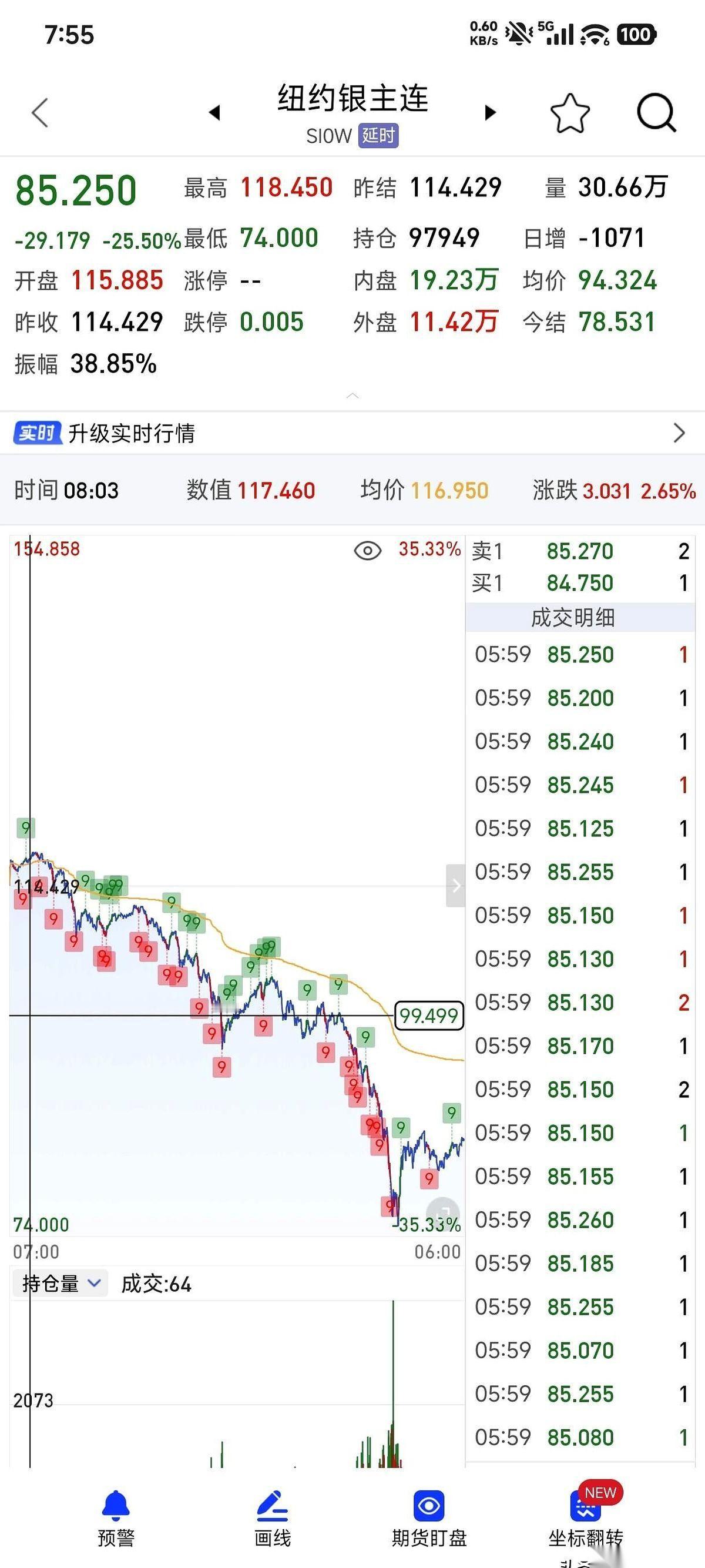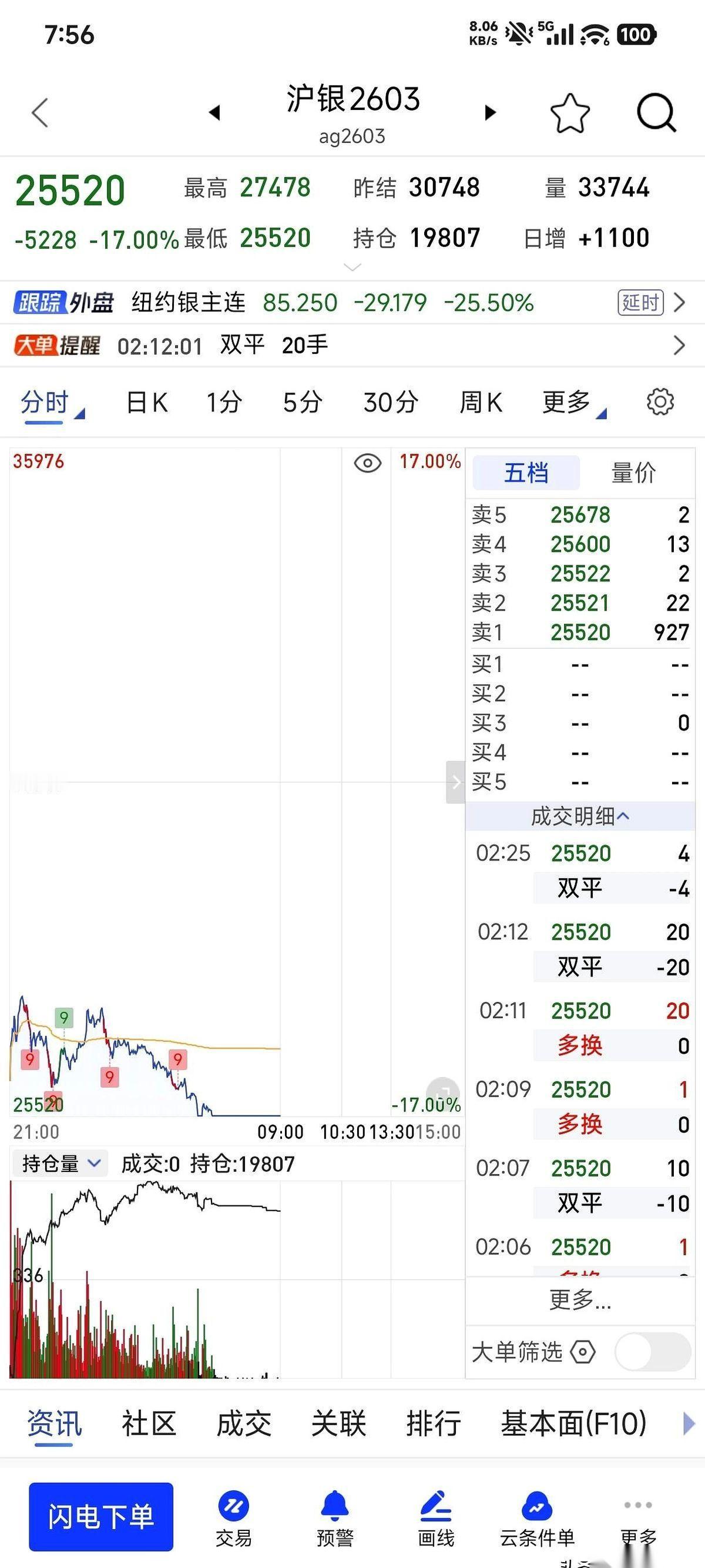 屏幕上,美盘白银那个-35%的数字,像一盆冰水从我头顶浇下来。 我抄底了。就在半山腰。我当时想得很简单,跌这么多了,肯定有个技术反弹,我进去捞一把就跑。 结果,我们这边直接封死在跌停板上。 卖出的按钮是灰色的,点不动了。我整个人僵在椅子上,一动不动。只能看着。 屋里没开灯,只有屏幕幽幽地亮着。国内的报价停了,一个鲜红的数字,像个句号。但我知道,这根本不是结束。 我把行情软件切到美盘,那边的线还在往下掉,一根笔直的瀑布,又砸下去19%。 它每跳动一下,我的心脏就跟着猛地一缩。我就像被绑在铁轨上,眼睁睁看着火车朝我冲过来,但我什么也做不了。 我攥着鼠标的手,指节都白了。 他们是不是没有实物白银去交割了?所以才这么往死里砸,想把我们这些多头全逼疯? 我现在脑子一片空白,就想知道一件事。 谁能告诉我,白银ag2603,明天的跌停价,到底是多少?