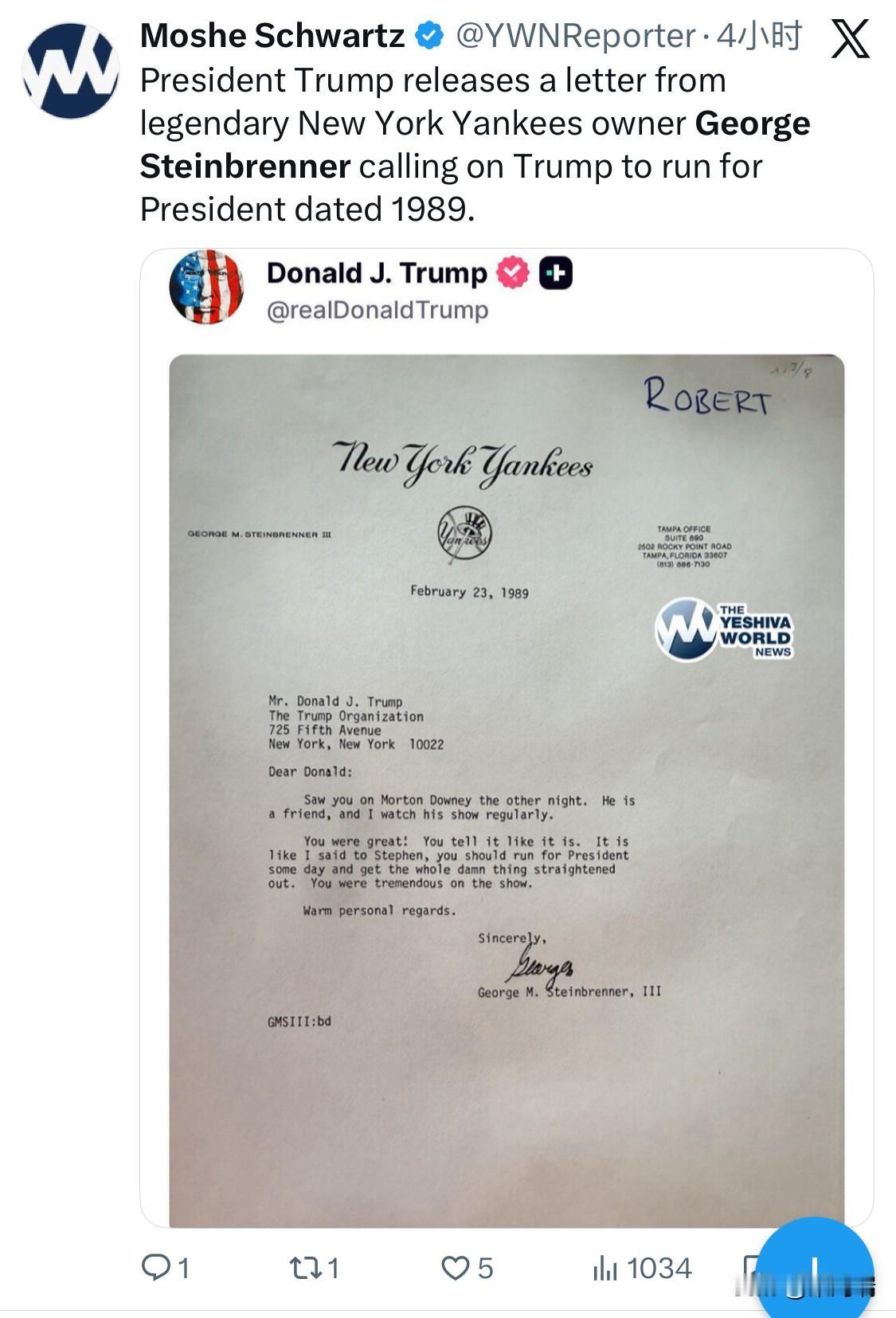 这封信是纽约洋基队老板乔治·斯坦布伦纳三世(George M. Steinbrenner III)写给唐纳德·J·特朗普的。 信件信息 日期: 1989年2月23日 发件人: 乔治·M·斯坦布伦纳三世,纽约洋基队办公室 收件人: 唐纳德·J·特朗普,特朗普集团 核心内容: 斯坦布伦纳称赞特朗普最近在《小莫顿·唐尼秀》(The Morton Downey Jr. Show)上的表现“非常出色”(tremendous),并建议他有朝一日应该竞选总统,“把这一团糟的事情全部理顺”(get the whole damn thing straightened out)。 背景和真实性 这封信是真实的,特朗普总统后来在社交媒体上分享了这封信。 斯坦布伦纳与特朗普关系密切,两人是多年的朋友。 特朗普当时在《小莫顿·唐尼秀》上讨论了外交政策和媒体问题。 斯坦布伦纳本人曾在1974年因违反联邦竞选法被判有罪,后于1989年1月获得罗纳德·里根总统的赦免。
