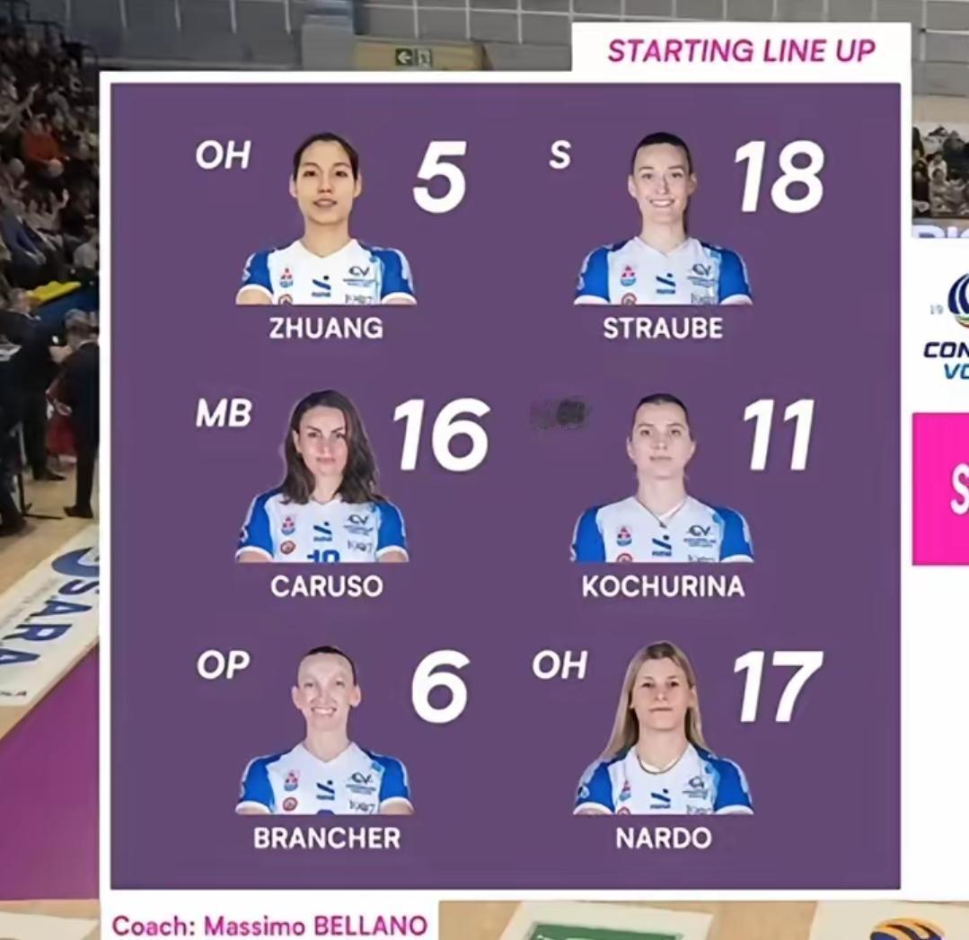 意甲联赛第22轮:庄宇珊领衔的圣乔瓦尼3:0横扫对手,赵勇全程观战 北京时间2月1日23点,意甲女排联赛第22轮保级关键战,圣乔瓦尼客场3-0横扫蒙维索,三局比分为25-18、25-17、25-20。此前圣乔瓦尼一度深陷降级泥潭,庄宇珊加盟前长期徘徊积分榜倒数,还曾1-3不敌蒙维索,积分被对手压制。 本场比赛,庄宇珊再度成为球队攻防核心,全场贡献10分,23次进攻10次命中,0失误仅2次被拦,扣球成功率43%,拿到球队三大边攻手最高分。一传环节她同样表现惊艳,15次接发零失误,73%的到位率和33%的完美到位率位居全场第一。庄宇珊的一传和进攻成为球队保级的关键战力。 拿下这场胜利后,圣乔瓦尼积20分暂列联赛第12位脱离保级区,球迷也对球队寄予更高期待。庄宇珊用自己的实力挽救这支队伍立下了汗马功劳。 值得一提的是,中国女排现任主教练赵勇全程观看了本场比赛。比赛结束之后,庄宇珊和赵勇还在场边进行了短暂的交流。 笔者预测,今年的亚锦赛,中国女排四大主攻手应该是:吴梦洁、庄宇珊、董禹含(唐欣)、李晨瑄。 福建 中国女排 江苏 天津