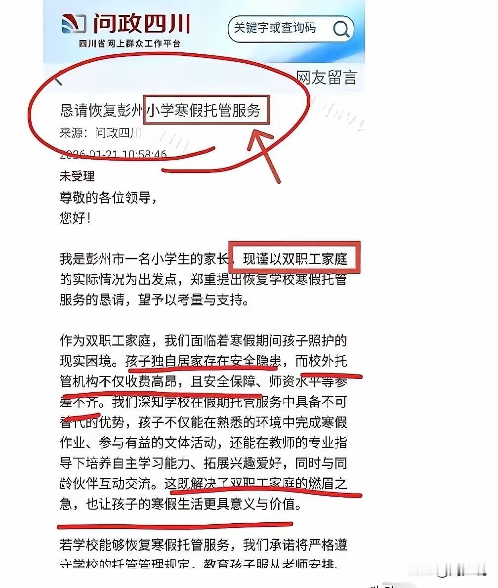 “恳请恢复小学寒假托管服务!”一位小学生家长在问政四川上的投诉,引发网友热议。她以双职工家庭的现实困境为由,郑重恳请恢复学校寒假托管服务。认为孩子独自居家,安全隐患让人揪着心;校外托管机构呢,收费高不说,安全保障和师资水平还没个准头。 这事传到网上后,不少网友纷纷附和:“学校托管才是刚需,熟悉的环境、靠谱的老师,比外面放心多了”! 也有网友表示:“可不是嘛,孩子在学校能写作业、参加活动,比在家看电视强百倍”。 客观的说,周少觉得学校托管的优势是校外机构替代不了的。孩子在熟悉的校园里,既能在老师指导下完成作业、培养自主学习能力,又能和小伙伴互动玩耍,寒假过得充实又有意义。 从另一个角度来说,如果恢复学校寒假托管,确实不仅能解双职工家庭的燃眉之急,更能让孩子的假期生活更具价值。 当然,从学校角度来说,恢复小学托管服务,也必然存在一定的问题,这些教师也需要休息,也有自己的家庭孩子需要照顾。就像有些网友所言,不能把什么都甩给学校,学校不是爱心福利战。#寻美三湘# #长沙新朋友#