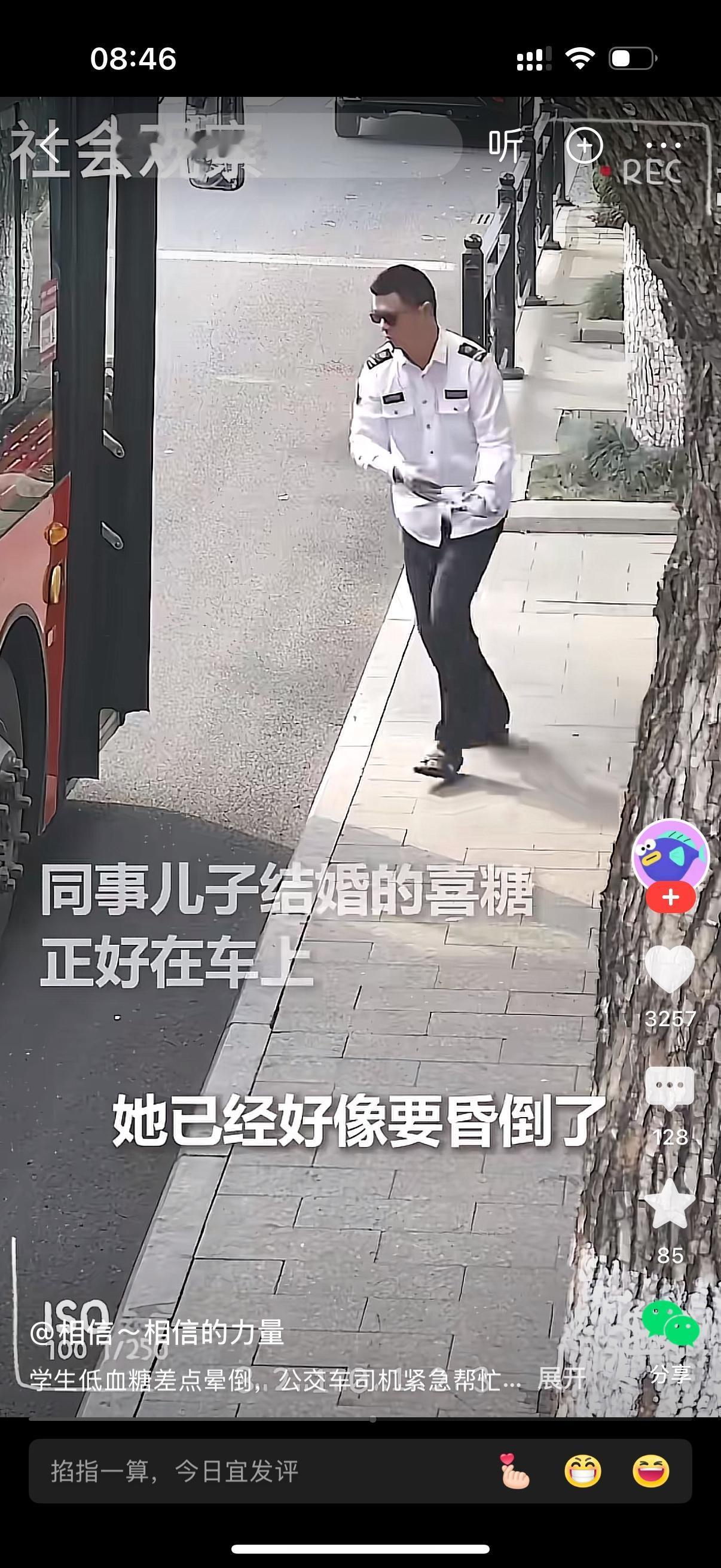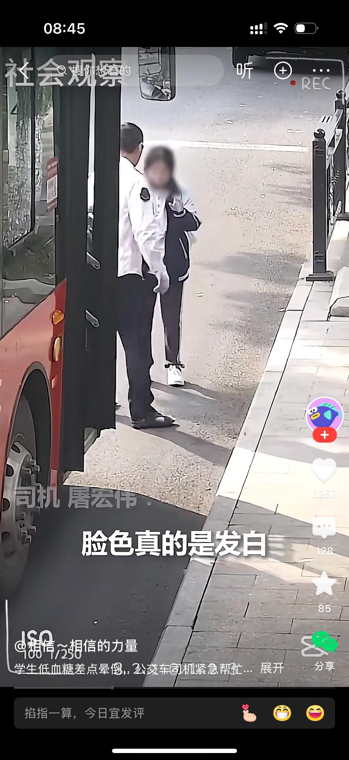 女学生乘公交车返校,下车后晃来晃去,好像要昏倒的样子。司机看到后,拉上手刹下车,看学生脸色发白,询问怎么回事?女生说,自己有低血糖。司机想到自己车上有喜糖,立即拿出来给女学生吃。车上的三位男生也下车守护女生,直到救护车到来才离开。人间自有真情在,司机和三位男生都是好样的。