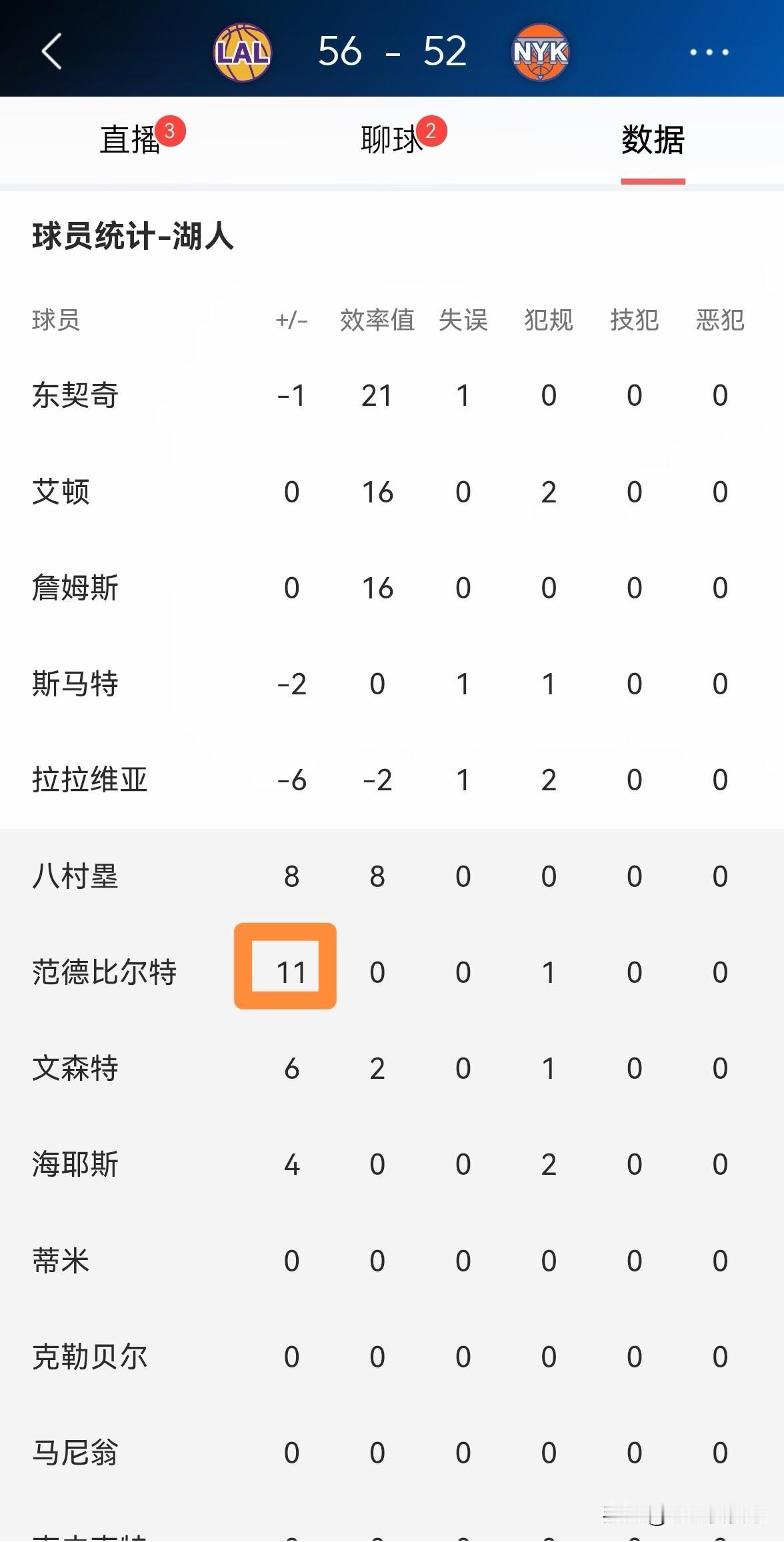 湖人悍将范德比尔特真是让人捉摸不透!在今天湖人客场挑战尼克斯的比赛中,目前双方半场战罢,湖人暂时以56:52领先对手。在前两节比赛中,发生了一件让我特别捉摸不透的事情,范德比尔特在替补出战的11分钟里,投篮2中0,仅仅依靠罚球得到1分,但是他的场上正负值却是全队最高的+11。 对于范德比尔特的表现,我真是百思不得其解,为什么他在仅仅得到1分的情况下却有全队最高的场上正负值?