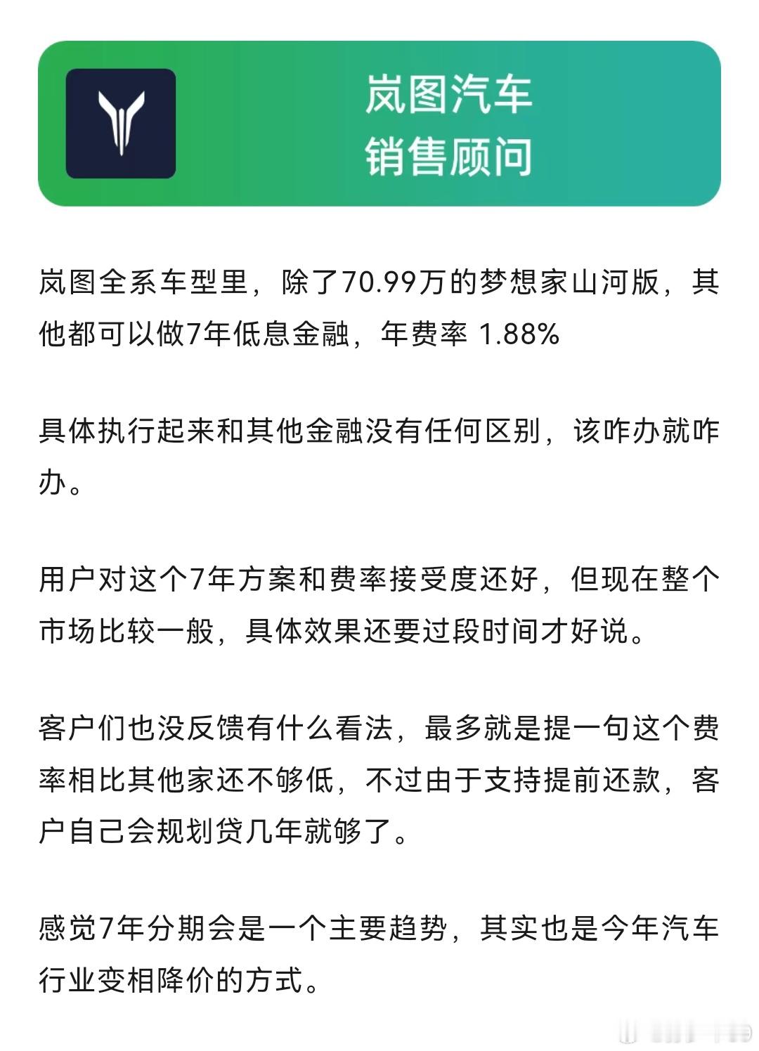 找了五个最早发布7年车贷的品牌,让销售来聊聊实际效果和用户反馈。结论挺统一的,对年轻客户效果比较好新能源汽车