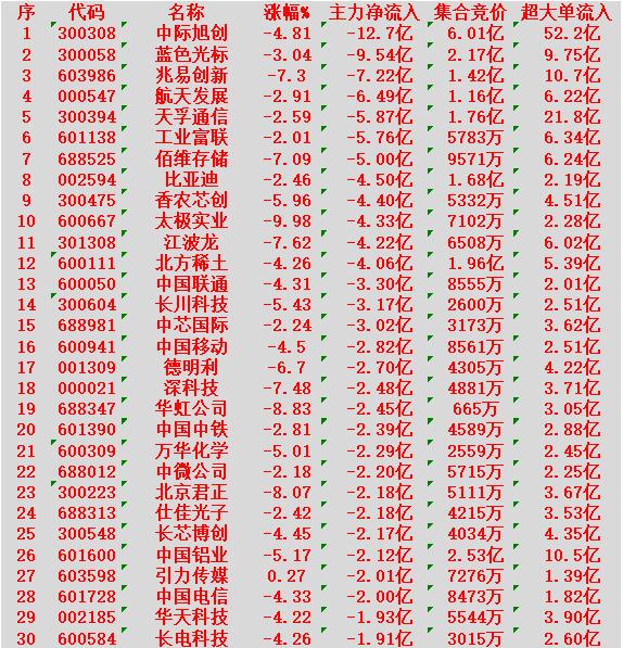 2月2日开盘45分钟,主力“卖出的 ”30名单! 中际旭创:净流出 12.7亿元。 蓝色光标:净流出 9.54亿元。 兆易创新:净流出 7.22亿元。 航天发展:净流出 6.49亿元。 天孚通信:净流出 5.87亿元