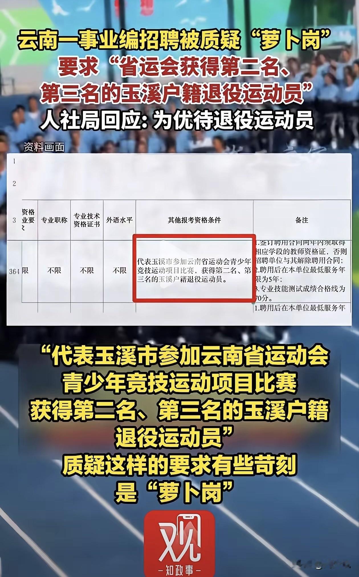 “萝卜岗?”云南玉溪一则事业编招聘公告火了!岗位要求直指“省运会获得二三名的玉溪籍退役运动员”,精准到让人咋舌,网友直言:“这条件卡得,不如直接报身份证号省事!” 这事在网上传开后,针对网友的质疑,当地人社局回应称,“为优待退役运动员!” 此回应,有人吐槽:“定向招聘也不是这么玩的吧,这范围窄得离谱,怕不是为特定人量身定制?” 也有网友理性表示:“扶持退役运动员就业是好事,但条件设置得太苛刻,反而丢了招聘的公平性。” 在周少看来,这样的招聘条件,看似合规且饱含政策温度,实则堵死了绝大多数人的上升之路。事业单位招聘本应秉持公开、公平、公正的原则,为各类人才提供同台竞争的机会。 这种近乎“量身定制”的条件,不光会引发大众对招聘公平性的强烈质疑,更会寒了无数求职者的心。说直白点,公开招聘就得拿出实打实的诚意,少搞些“精准筛选”的小动作,才能真正选拔到合适的人才。 更何况,这种过度“精准”的条件设置,不仅容易滋生非议,更可能直接违背公开招聘的初衷。 总而言之,招聘从来不该是“量身定做”的“选择题”,而应在政策导向和公平原则之间找到精准平衡点,唯有如此,才能真正选拔出德才兼备的优质人才。#寻美三湘# #长沙新朋友#