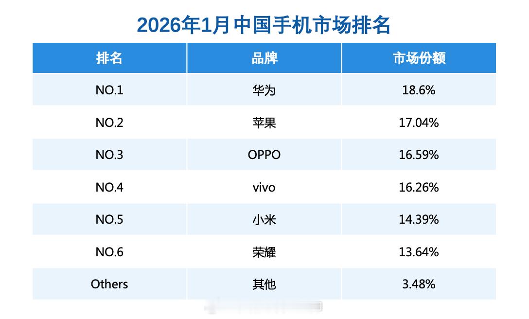 王者回归!华为手机中国市占率18.6%,再夺1月中国手机市场份额第一。据数码博主 公布的统计数据,截至2026年1月底,华为Mate80系列销量约254.32万,超越Mate70同期,市场表现强劲。华为还在1月开启了春节限时优惠,部分手机最高降价2000元,带动多款产品热销。华为再夺1月中国手机市场份额第一华为领跑新年手机市场手机销量