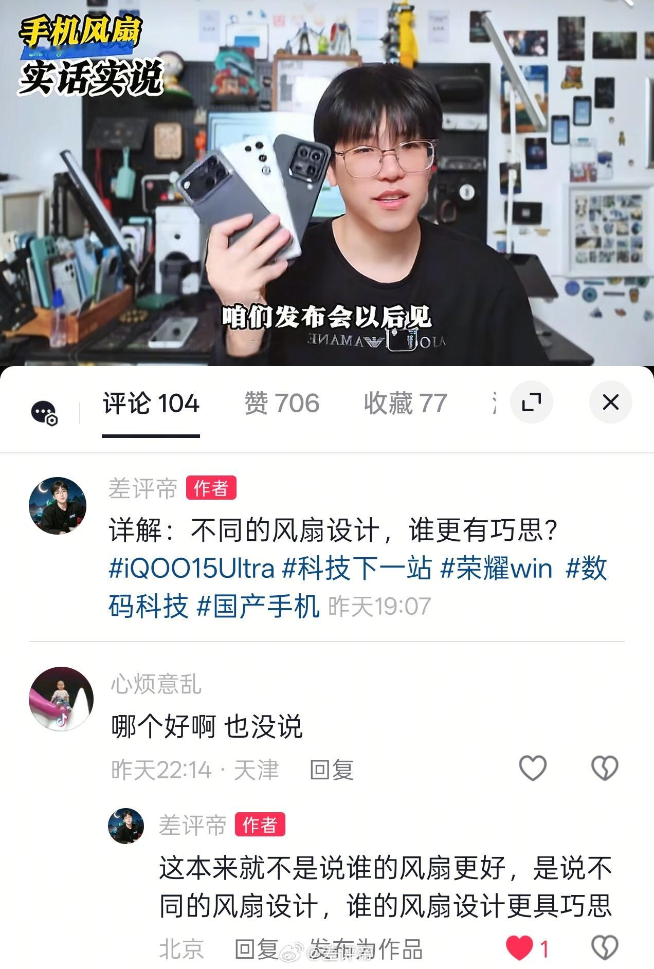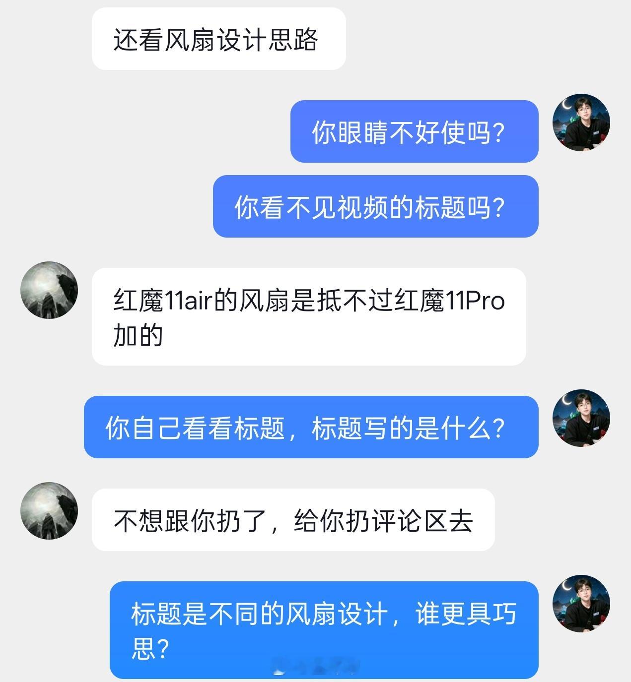 真绷不住了流量大了,什么样的人都能遇到我把近期收到的几个带风扇的设计拿出来给大家讲了一下他们的风扇设计我没有说谁的好谁的不好特别是红魔我还说他这个设计特别聪明结果?莫名其妙一群看不懂视频的人就来喷我为什么不拿红魔11Pro+比?我这个人诚实我说红魔就给了我11air我这个视频是给大家讲近期手机的风扇设计思路,不是对比谁散热效果好吧对吧,iQOO15Ultra也没发布呢?结果,这个哥们让我拿出证据,问我有什么证据,手机是红魔给的当我拿出证据以后,让他看清标题和视频内容之后,他又破防了经典的破防:我不跟你说了,我给你扔评论区有点东西