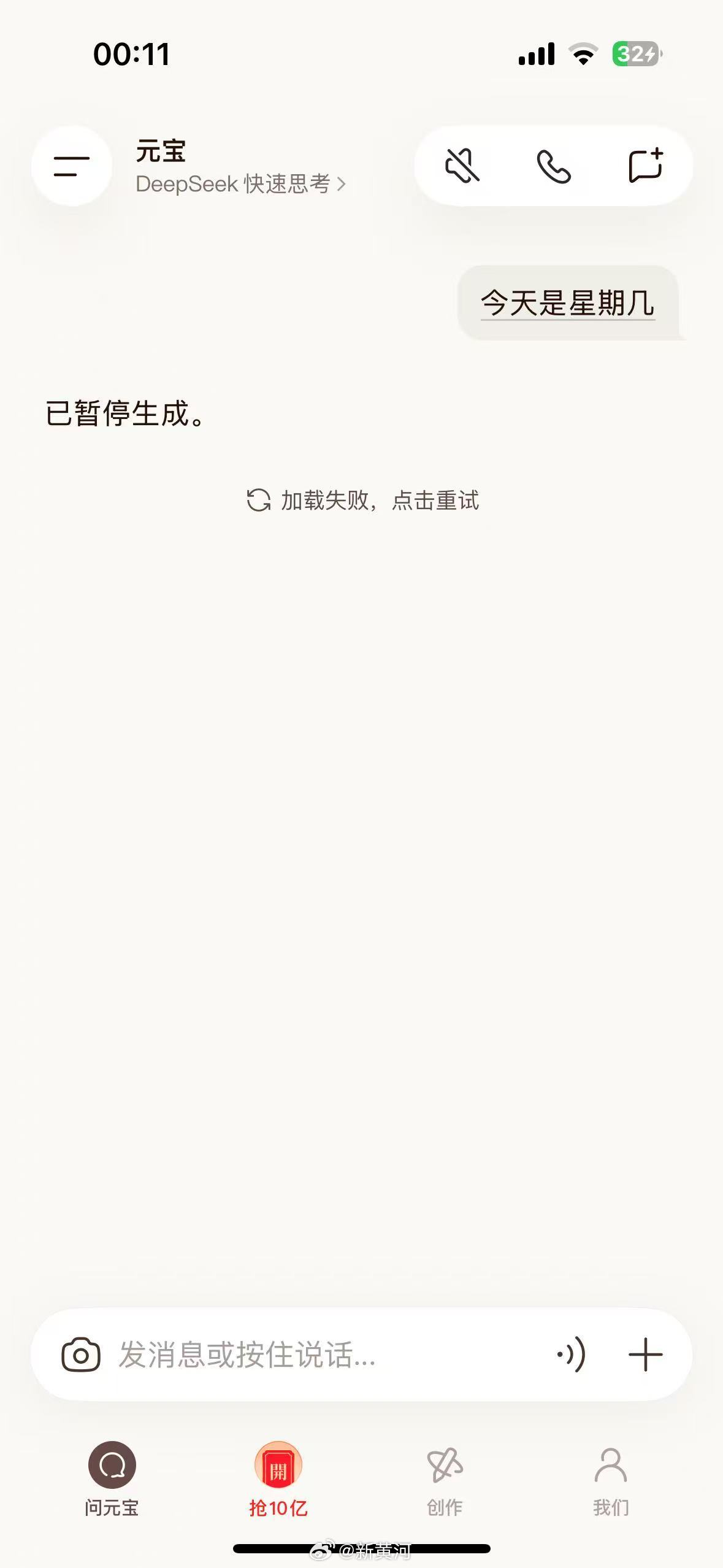 【#腾讯回应元宝崩溃# 】2月1日,腾讯针对旗下AI产品元宝开启春节红包拉新活动。2月2日凌晨,有网友开始新一轮抢红包体验中,发现元宝出现崩溃状态,截图显示,该用户向元宝输入简单提问“今天是星期几”,但元宝出现暂停生成、加载失败。