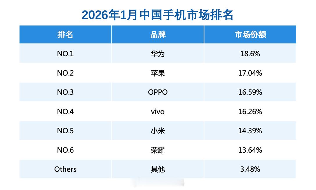 华为领跑新年手机市场 市场份额提升至18.6%,目前中国手机市场份额第一,数据来自第三方销量数据(Sell out)。