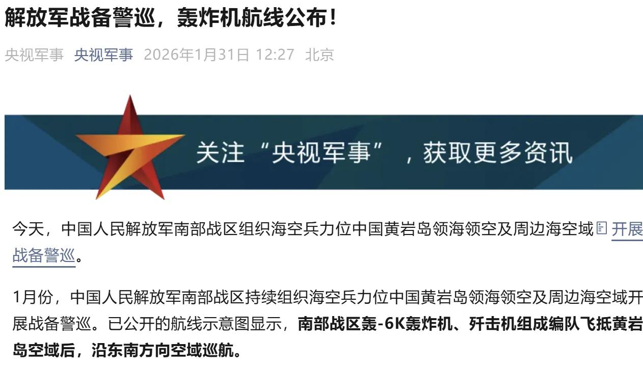 2月2日,据央视军事网站报道,1月31日,南部战区组织海空兵力战巡黄岩岛,其中派出多架轰一6K远程战略轰炸机和歼一16战斗机对黄岩岛附近区域战巡。 彻底震慑敌人,让域外国家知道中国🇨🇳也是不好惹的,惹急了!是不好办的。[赞][赞][赞][赞][赞][赞]