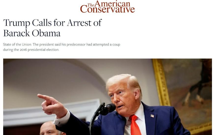 特朗普要求逮捕奥巴马?!特朗普指控巴拉克·奥巴马捏造“通俄”指控构陷自己,并称奥巴马理应被逮捕。 说白了,特朗普要求逮捕奥巴马,表面看是前总统间的私人恩怨,实则是美国两党政治清算的终极闹剧,更是司法沦为权力工具的危险信号,这绝非简单的口水仗。 要知道,2 月 1 日特朗普在 “真实社交” 上怒吼 “立即逮捕奥巴马”,拿国家情报总监加巴德解密的 “拉沙盖特” 文件当铁证,称奥巴马 2016 年伪造 “通俄” 情报、发动 “政变”,连希拉里、拜登都被指涉案。这架势活像拿着鸡毛当令箭砸司法大门。 可这绝非单纯的报复,而是特朗普为选举造势的政治算计。2016 年 “通俄门” 调查缠了他整整四年,如今借解密文件翻旧账,既能煽动支持者情绪,又能转移自身官司焦点。说白了,就是拿前总统当竞选道具。 说实话,所谓 “铁证” 早藏着致命漏洞,根本站不住脚。加巴德的报告虽称奥巴马改情报口径,但原始评估从未公开,且米勒特别检察官当年已认定 “无通俄证据”。特朗普拿未经核验的文件喊 “叛国”,纯属自说自话。 而奥巴马团队的反击早让局势成了舆论混战。奥巴马发言人怒斥指控 “荒谬到不值一驳”,民主党则曝光加巴德曾是特朗普心腹,指责其 “伪造证据”。双方支持者在线上互骂,美国社会撕裂得更厉害。 更可怕的是,司法系统已被架上 “火刑架”,左右为难。特朗普施压司法部启动调查,司法部长若查就是 “政治工具”,不查就是 “包庇民主党”。这种对司法独立的践踏,比指控本身更危险。 并且,盟友早看穿这场闹剧,美国软实力在掉价。欧盟外交官私下吐槽 “这哪是民主国家该有的样子”,连日本、韩国都在观望,生怕被美国的内耗拖下水。 要清楚,1972 年 “水门事件” 后,美国也曾陷入政治清算,但当时司法还能守住底线。如今直接喊着抓前总统,比当年的对立激烈十倍,历史的刹车早就失灵。 而未来,局势大概率就两种走向:一种是司法部顶住压力,以 “证据不足” 终止调查,特朗普的指控沦为选举噱头,但两党仇恨更深,下次掌权必加倍报复; 另一种是特朗普强行推动调查,引发民主党大规模抗议,国会甚至可能启动弹劾,美国陷入宪政危机,政策停摆、经济动荡。关键转折点就在加巴德的原始证据能否公开,若证据造假,特朗普会彻底失信;若被坐实,美国的制度神话将彻底崩塌。 说到底,特朗普喊着抓奥巴马,不过是场拿国家制度当赌注的选举秀。这场博弈的本质,是权力凌驾于法律的公然挑衅,是两党恶斗对美国民主根基的终极摧毁,再闹下去,所谓的 “民主灯塔” 只会变成 “乱政笑话”。 以上是小编个人看法,如果您也认同,麻烦点赞支持!有更好的见解也欢迎在评论区留言,方便大家一同探讨。