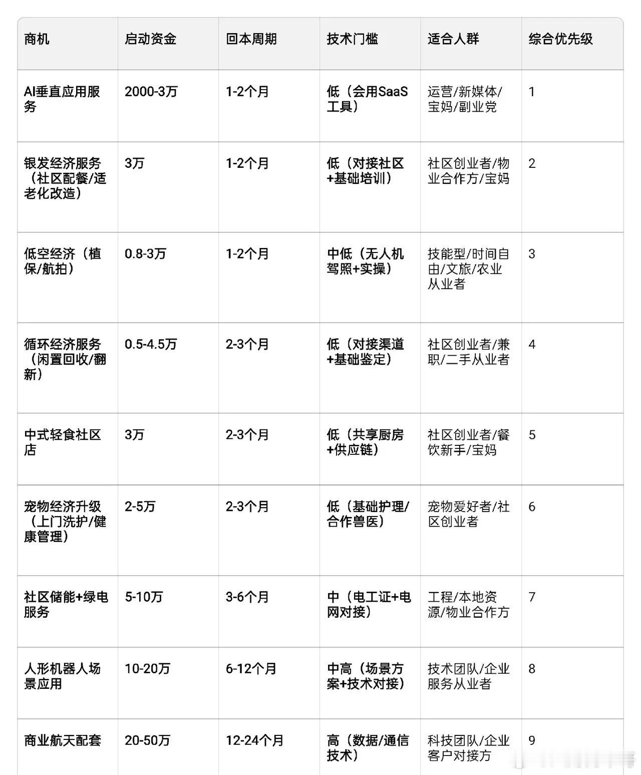 2026年新商机集中在政策支持+技术落地+需求升级三大方向可落地的核心赛道!一、政策驱动·高确定性- 社区储能+绿电服务:AI算力与新能源并网刚需,多地有补贴。轻资产做本地储能EPC对接、售后运维或户用储能推广,毛利率15%-25%,启动资金约5-10万,无需囤货。- 循环经济服务:二手流转、再生资源回收、旧物翻新享补贴,个人闲置回收补贴最高30%。盈利点:闲置流转5%-8%佣金、旧物翻新40%-60%毛利、补贴申报服务费3000-10000元/单。- 低空经济场景运营:2026年规模破1.5万亿元,空域开放、示范区落地。无人机农林植保60-120元/亩、低空航拍800-3000元/条、物流配送4-18元/单、低空观光200-500元/人,启动资金约8000-4.5万。二、技术落地·高弹性- AI垂直应用服务:大模型落地加速,帮企业做AI客服、数字人内容、营销自动化更易变现。轻资产用成熟SaaS工具,单条AI数字人视频成本最低17元,垂直IP广告报价5000-2万元/条。- 人形机器人场景应用:2026商业化元年,优先做工厂巡检、养老陪护、物流搬运等“场景插件”,核心零部件降本、AI自适应突破。- 商业航天配套:民营火箭回收与大载荷技术突破,卫星应用爆发,切入卫星宽带、遥感数据服务、地面站运维,轻资产对接需求方拿订单。三、需求升级·现金流稳- 银发经济服务:60岁以上人口破3亿,适老化改造、慢病管理、老年配餐刚需。社区养老配餐客单价20-40元,周预订复购率超60%,月净利1.5-4万元,启动资金约3万。- 中式轻食服务:2026年轻食市场规模破5000亿元,中式热烹轻食增速最快,社区店享场地补贴2000-5000元/月。- 宠物经济升级:医疗、殡葬、智能用品、定制服务需求增长,轻资产做宠物健康管理、上门洗护、宠物IP内容,复购率高、现金流快。四、轻资产切入建议低空经济:先考无人机驾照(约8000元),从植保/航拍切入,积累客户后拓展物流/观光。AI应用:聚焦垂直行业(如母婴、美妆)做数字人IP,对接中小品牌提供内容服务,试错成本低。储能服务:对接本地电网/企业做储能EPC与运维,赚佣金+服务费,回款稳。银发服务:与社区/物业合作,提供配餐、适老化改造、健康监测,政策支持+需求刚性。