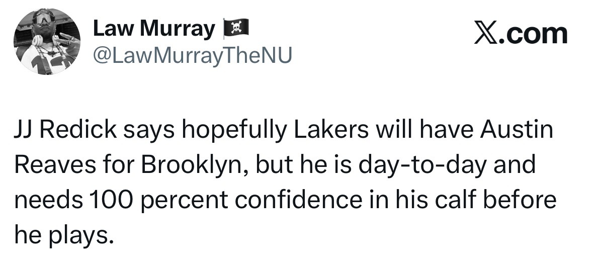 雷迪克表示,希望湖人能让里夫斯出战对阵篮网的比赛,但里夫斯目前状态为每日观察,需
