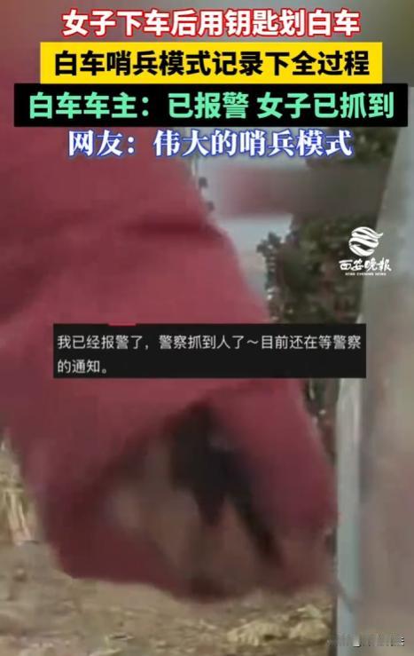 以前是举头三尺有神明,现在是举头三尺有监控!河北,一辆白轿车停在车位,车身洁白如新,这时一辆蓝车开到白车旁停下,下来一位身穿大红棉袄、系着腰带的女子,她锁好车门后,竟做出惊人举动,左手拿着车钥匙,用力朝白车划去,只听尖利声响,白车被划出两道划痕,女子不解恨,又划了一下,车身被划花,她以为无人看见,得意洋洋地四处张望后悄然离开,可她没想到,白车开启着哨兵模式,已把她的举动拍了下来。 (来源:西安晚报) 1月27,有个白车车主办完事往停车点走,远远瞅见自己车,像被人划了几道子,漆都翻起来了。 他赶紧掏手机拍照,这车是去年攒钱买的,平时擦得跟新的似的,现在车门旁边三道深划痕,最长的能有二十公分,底漆都露出来了。 突然想起车装了哨兵模式,刚才手机好像震了一下,当时没在意,现在赶紧打开APP看监控,视频里明明白白:一个穿红棉袄的女的,从旁边蓝车下来,锁门时还拽了拽车门,确认锁好了,手伸兜里掏钥匙——不是开自己车,是往白车身上划。 一下、两下、三下,劲使得不小,划痕都裂开了,划完她还不走,站那儿左右瞅,抬头看了眼监控摄像头,可能以为是摆设,拍了拍手上的灰,转身要走。 车主把视频导出来,直接报了警,民警一看就笑了:这女的住附近小区,蓝车天天停这,上回跟人吵架还是我们去调的解。没两小时,民警敲开了女的家门。 当时她还在厨房炒菜,看见民警,锅铲都掉了,脸煞白,问她划车的事,一开始嘴硬说没划,等监控视频一放,她说那天跟老公吵架,他说我乱花钱,我看见那白车比我车好,心里堵得慌,就…… 后来算了笔账,白车补漆得三千多,还得抛光、做钣金,女子得全赔,另外还要拘留五六天,留案底。 她老公知道后,连夜凑钱送过去,跟车主道歉:我老婆平时挺温柔的,那天犯了浑,对不起。 其实哨兵模式真不是摆设,现在好多车都有,只要有人碰车,立马录像还发提醒,车主后来跟朋友说:幸亏装了这玩意,不然我得自认倒霉,三千多块钱够我加俩月油了。 女子故意划车不是小事,轻则赔钱拘留,重则判刑,案底还影响孩子上学,做坏事得付出代价。 女子的行为,这妥妥的是故意毁坏财物。 根据治安管理处罚法第四十九条,故意损毁公私财物的,处五日以上十日以下拘留,可以并处五百元以下罚款。 但这只是底线!关键看车损金额,一旦经鉴定损失超过5000元,或者像她这样毁坏三次以上,根据刑法第二百七十五条及立案追诉标准,直接构成故意毁坏财物罪,面临三年以下有期徒刑、拘役或者罚金! 更狠的是,现在的哨兵模式视频属于刑事诉讼法规定的视听资料,证据链闭环了,她想抵赖说是过失刮蹭根本没戏。 哪怕金额不够刑事标准,行政拘留加全额赔偿也跑不掉,这案底要是留下,以后考公、贷款都受阻。 最细思极恐的是,如果她是因为嫉妒或寻衅滋事,动机卑鄙的话,法院量刑时绝不会手软。 你觉得仅仅因为一时的心理扭曲,就要用几年的自由和一辈子的污点去买单,这代价是不是太沉重了? 不管多生气,别拿别人东西撒气,现在到处是监控,干坏事根本跑不了,车该装的安全配置别省,关键时候能帮大忙。 你说这女子,就因为一时的气,把自己生活搞乱了,赔钱、拘留、留案底,连孩子都跟着受影响,多不值? 人得学会控制情绪,别让坏脾气冲昏头。 白车车主,虽然车被划了,但因为有哨兵模式,很快找到人,也算不幸中的万幸,科技这东西,关键时候真能省事。 做个守法的人,别干坏事,不然早晚得栽,就像那女子,以为没人看见,结果哨兵模式把她拍得清清楚楚,这就是“天网恢恢”。 女子划了别人的车,自己赔了钱、蹲了拘留所,还得被人指指点点,多惨?所以做人得厚道,别干缺德事。 控制情绪、用科技保护自己、别干坏事,比什么都强。 对此,你怎么看呢?