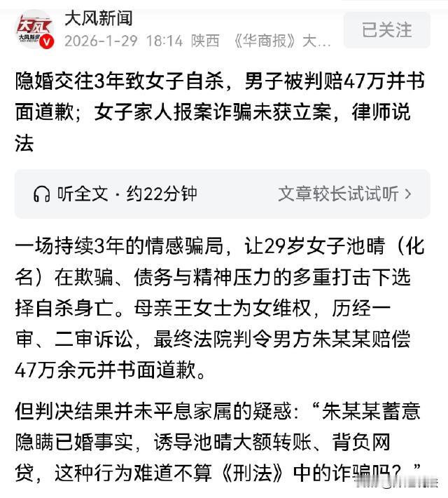 湖北,一男子号称自己是做工程的,跟一25岁女子相亲之后去开了房,但男子悄悄把女子的隐私给拍了下来,之后还把不雅照发送给朋友看。一开始女子不知道,还以为眼前的男子值得托付,甚至还拿出自己20万的积蓄借给男子,后来男子又来借钱,女子贷了33万给男子。没成想,最后发现男子早已结婚生子。 本新闻来源:大风新闻报道。 据报道称,在得知男子恶行之后,女子提出分手,男子不但不还钱,甚至还猥亵女子,发出“不死不是人”的威胁,最后,女子被压迫的只能自己走向了极端...... 25岁的迟女士带着对结婚的憧憬,被朋友介绍,去认识了一名男子朱某。二人相亲之后,对方说自己未婚,还是一位工程师,承包了大型的工程项目。 迟女士看到眼前这位男子挺不错的,就同意了交往,两个人还去开房了。谁知朱某悄悄把迟女士的隐私照片给拍了下来,当时迟女士还不知道。 第二天,为了让迟女士更加相信自己想要结婚的决心,朱某带着迟女士回家见了亲人,而且还承诺,之后一定会娶迟女士,会一起打造家庭。 自此之后,迟女士才算是吃了定心丸,准备跟朱某好好相处。 然而,没多久后迟女士就怀孕了,但是朱某却说,事业还没有稳定,也没有实现结婚的承诺,让迟女士去把孩子给弄掉。 听到这话,迟女士有些心灰意冷,但是还是去把孩子给弄了。 因为这事,朱某之后对迟女士还算不错,也是把迟女士的心安抚的服服帖帖的。然后就开始找迟女士借钱,说工程资金周转不来。 迟女士先是将自己打工积蓄20万借给了朱某,之后又帮忙贷了33万,也给了朱某。单纯的迟女士,真的是一个好女孩。 这3年时间里,朱某倒也是会按时还钱,有的时候还会多还一些,说是偿还利息。但是也没有完全还清,不过对此迟女士感觉,朱某是一个信守承诺的人。 直到有一天,迟女士无意间翻看朱某的手机,却发现,朱某早就结婚生子了,还有一个孩子。并且,这些年,他在外面还有别的女人,跟不少人保持着暧昧的关系。 虽然朱某还有钱没有还给自己,但是迟女士已经深受打击,直接就把朱某给删除了。 最为可气的是,这个朱某还把跟迟女士发生男女关系的照片,发给自己朋友看。实在令人忍无可忍,迟女士选择跟他分手。 看到迟女士跟自己分手,朱某反而恶人先告状,开始猥亵迟女士,经常就发短信过来辱骂迟女士。 “不死不是人”,“我要给你外婆寄盒子!”这些都是朱某给迟女士发的威胁性语言。 由此看来,朱某真的是不知羞愧,这让迟女士感到很疲惫,于是就报了警。谁知道办案人员则说,这是男女朋友之间的情感纠纷,只能你自己去投诉处理。 这个时候的迟女士已经精神崩溃了,她也知道,那些钱款可能要不回来了,因为现在想要摆脱朱某的纠缠都很难。 就在一个夜晚,迟女士选择结束了自己,她决定走向命运的终点...... 妹妹跟妈妈得知了这件事,她们准备替迟女士讨回公道,于是就一纸诉状将朱某给上诉了。她们要求朱某赔偿140万,并且道歉。 最后一审判决朱某隐瞒已婚已育事实存在过错,但是迟女士也需要承担一定责任,判定朱某赔偿47万元。但是却拒绝道歉。 但是妹妹跟妈妈还在坚持,继续在为迟女士奔走。 本案释法:朱某在已婚已育的情况下,谎称单身还跟他人交往,最后导致女子精神奔溃离世,朱某将面临怎样的法律责任? 根据《民典法》规定,隐瞒已婚已育的事实,跟女子交往,其行为违背公序良俗,存在明显过错,最后造成女子间接离世,存在因果关系,需要承担一定的法律责任。 朱某隐瞒婚姻状况,给女子精神洗脑、让女子借钱给自己、同时还感情俘虏,让女子遭受情感困扰,最后难以忍受选择自我了结离世,朱某肯定要承担部分的连带责任。 虽然法律上暂时没有将情感诈欺作为定罪方向,但是朱某的行为触犯道德标准、也触碰了法律底线,还是需要承担民事侵权责任。 间接因素导致女子离世,男子不仅要承受道德谴责,也要做出民事赔偿。 对此,您怎么看呢?