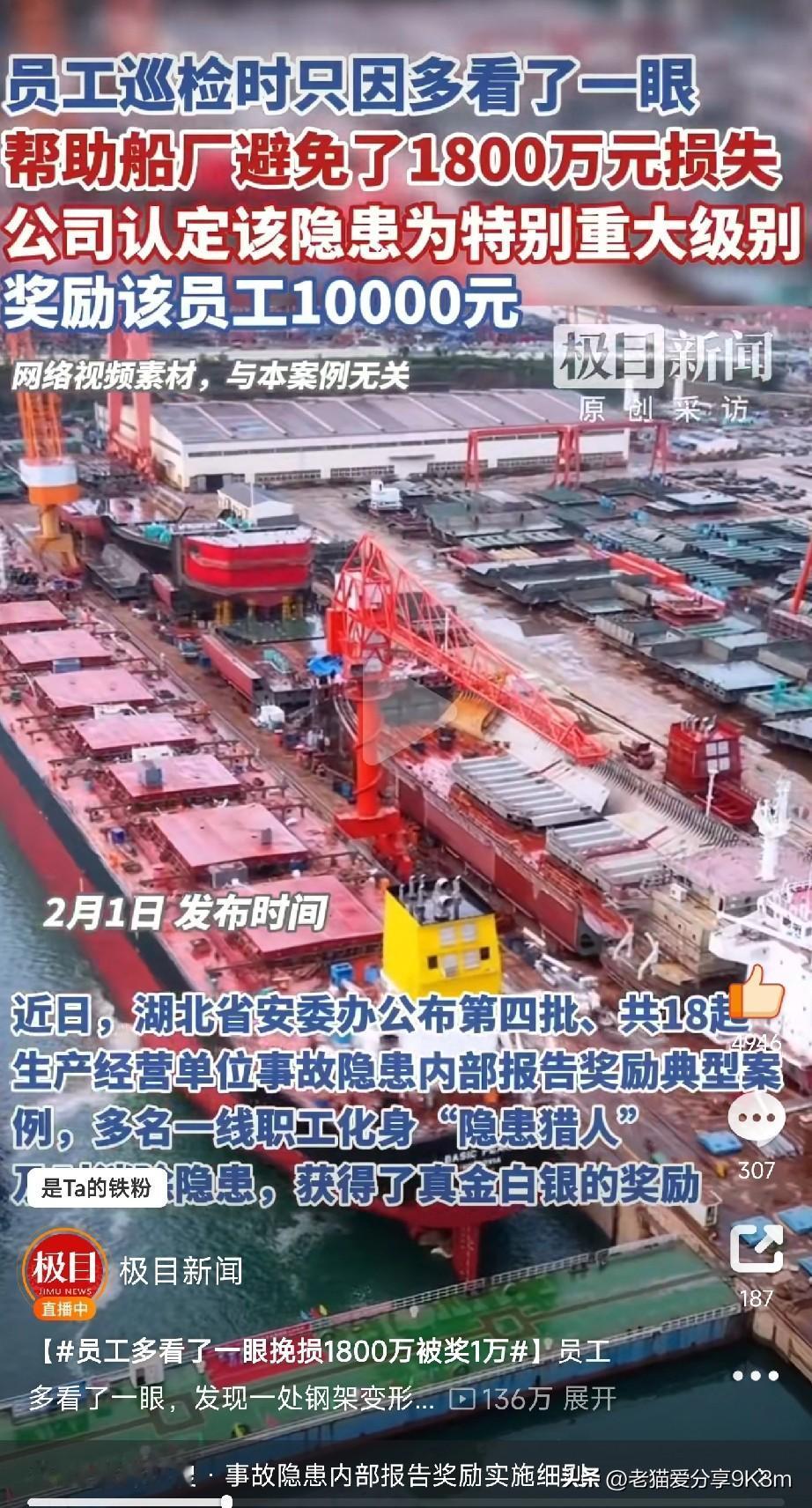 今天刷到一条新闻,武昌船舶重工的员工老张(化名)日常巡检时“多看了一眼”,发现大型钢架变形,紧急叫停作业,直接避免了一场价值1800万的船舶倒塌事故! 这得多强的责任心和观察力啊?网友直呼:“这眼睛简直是‘黄金瞳’!” 想想都后怕——要是没发现,钢架一塌,损失1800万是小事,万一伤到人可就是大悲剧了! 公司反应也很给力,直接奖了老张1万元,还封他“黄金猎人”,连先进事迹都拍成教育片了! 这波操作必须点赞!既奖励了功臣,又给全员敲响安全警钟。 但更重要的不是钱,是这份“多看一眼”的安全意识!就像网友说的:“责任到位,才是真的靠谱!” 现在企业给员工发奖金、授称号,就是告诉大家:细心排查隐患,不仅救企业,更是救自己! 安全无小事,一线员工的“多查一步”可能就是救命稻草!企业把奖励落到实处,员工才更有动力当“安全吹哨人”。 希望各行各业都学学这招:奖励机制搞起来,安全意识提上去! 咱们打工人也得记住——工作多留个心眼,可能就避开大祸! 为老张点赞,也愿所有认真负责的人都能被看见! (文章素材来自极目新闻,侵删)