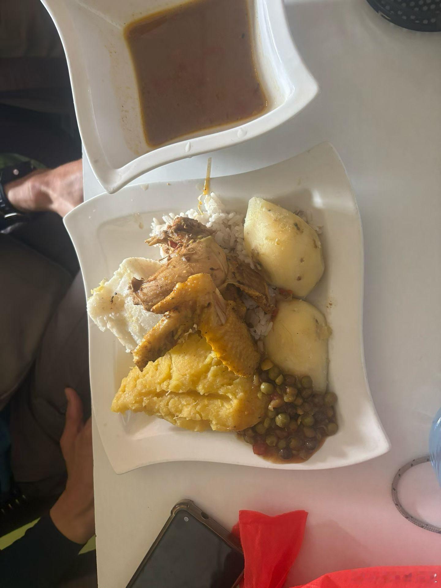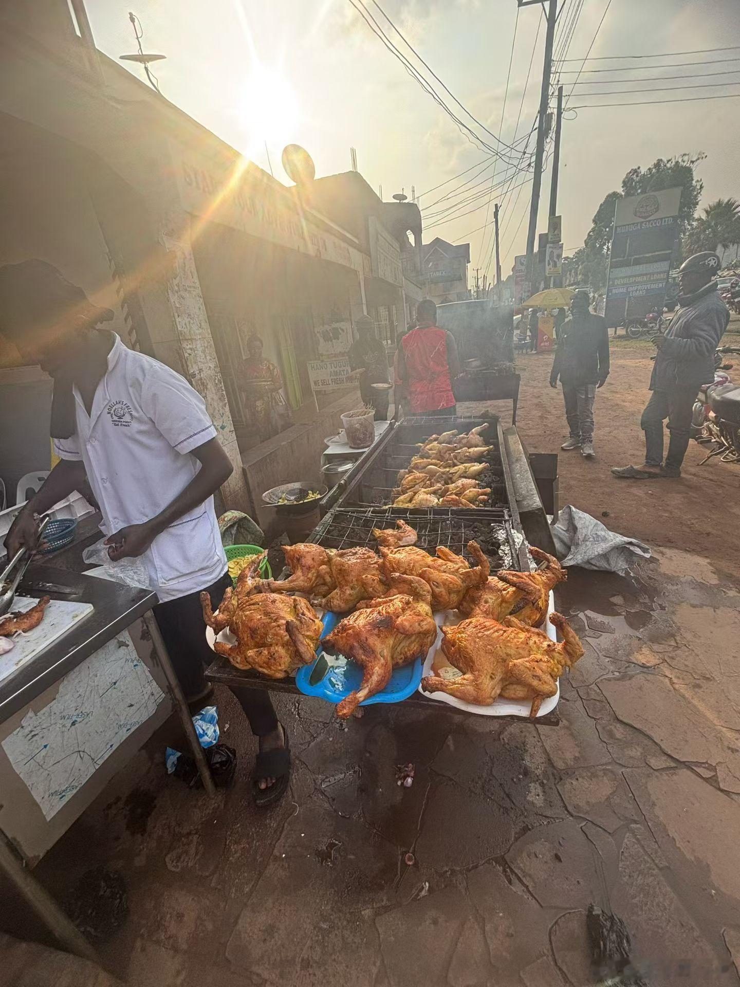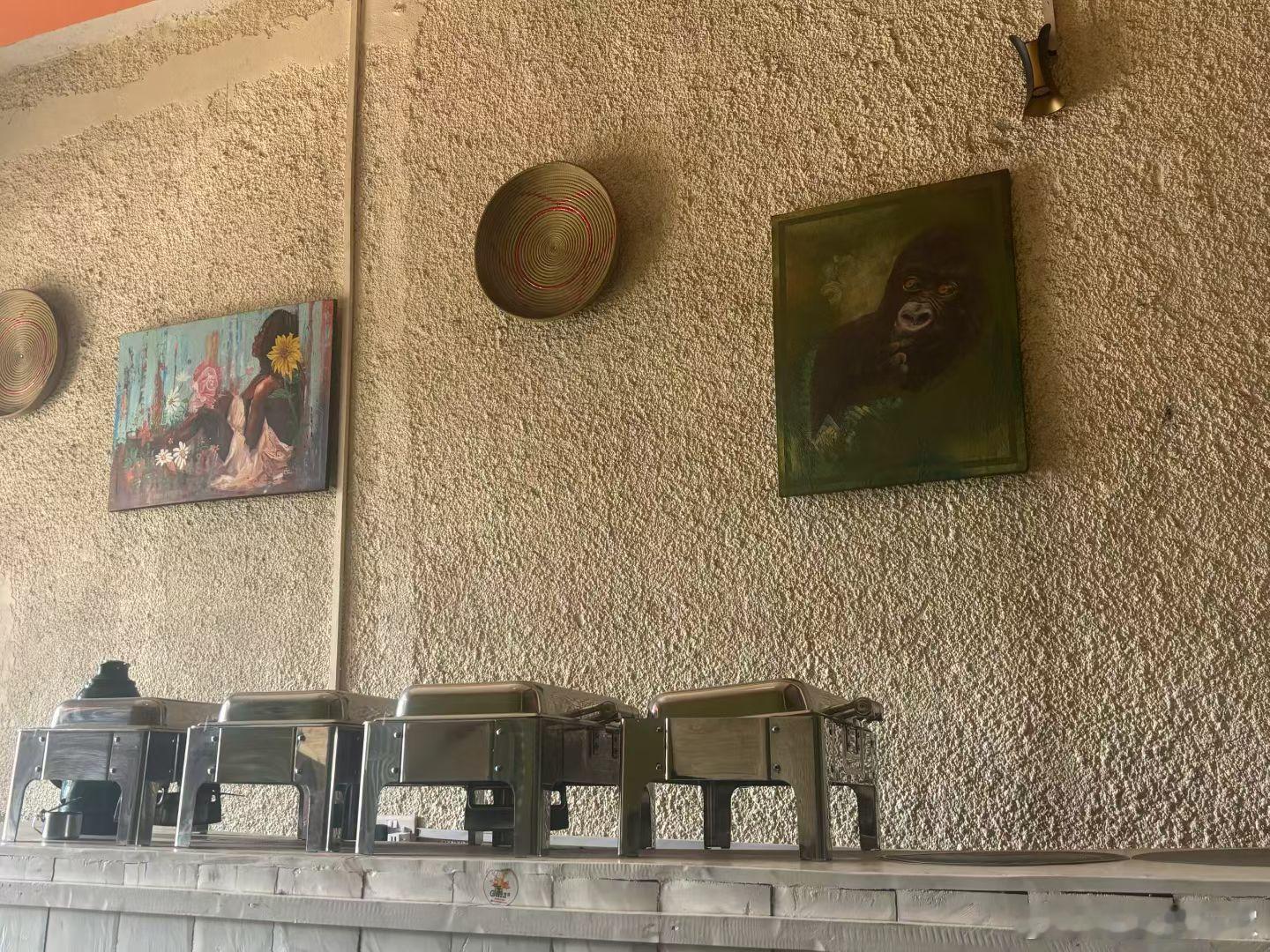 这是我们在乌干达kisoro小镇,另一家餐厅吃的鸡腿饭,价格只有网红餐厅的一半,但是环境差了很多,我朋友点了饭,我没敢吃,主要是我并不饿,也不想吃这个鸡腿饭,他们说挺好吃的,还想要餐厅墙上的壁画,一百多美元,太贵了,我们就问问,路上我们又去买了烤鸡,十块钱一个鸡腿,朋友看我之前吃过,也想尝尝,我劝他们不要买,很容易拉肚子,但还是买了,事实证明,他们也没事。但是如果你要尝试,量力而行!
