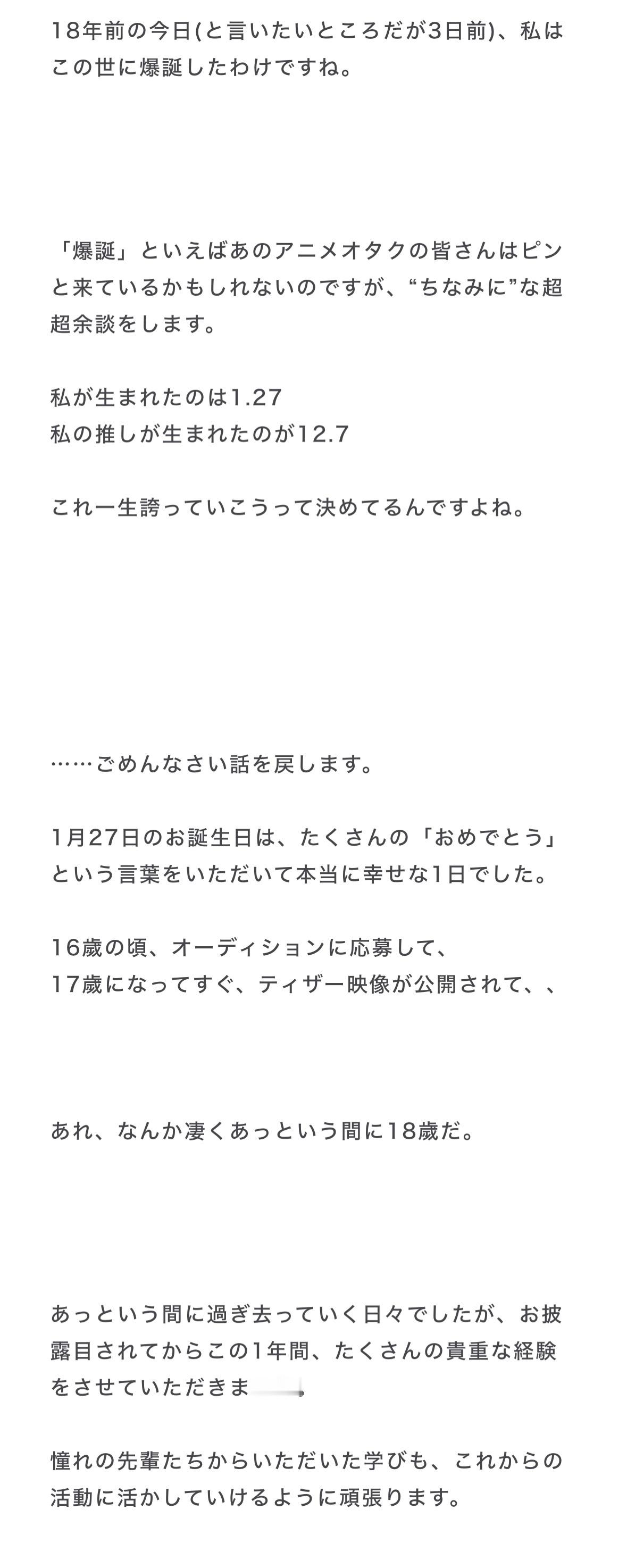 矢田萌華「18歳って、大人だけどオトナじゃない、けどだからといってもう子供でもいられない。大人と子供の境目にいる不安定な時期ですよね。逆に言えばどちらにもなれるということなので、それを強みにして今年は生きていこうと思っているんですが。 というわけでわたし、18歲になりました。」
