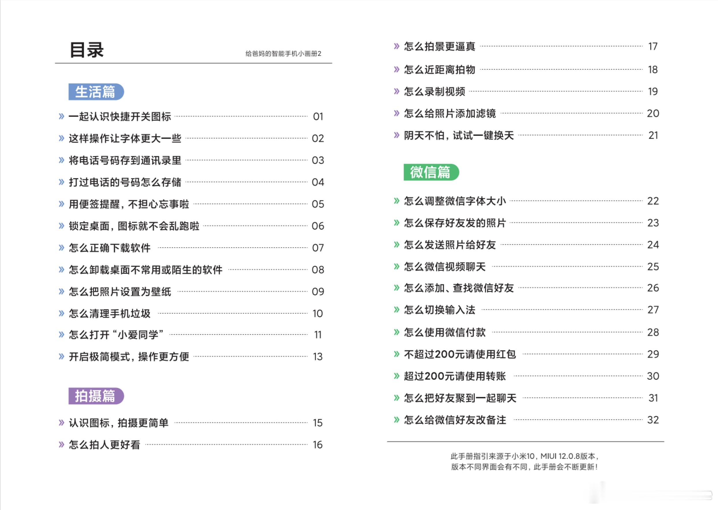 过年教长辈用手机 其实小米之前出过教长辈用手机的智能手机小画册,包含老人最常用的生活、拍摄、微信三个篇章,内容还是挺丰富的。