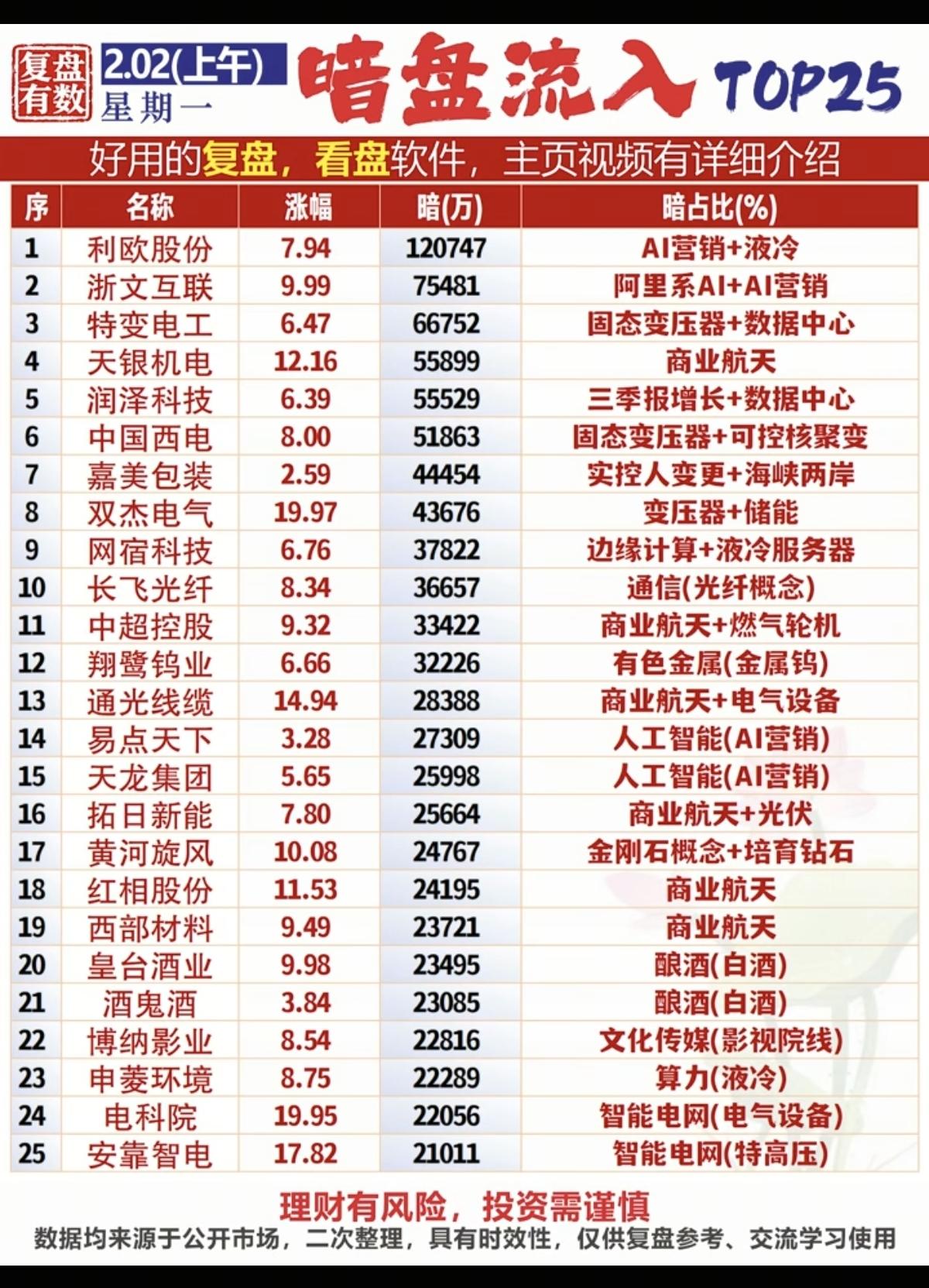 2.2周一 主力 暗盘资金 抢筹个股榜! 市场热点方向:资金抢筹方向! 一、智能电网, 二、特高压输电设备 三、酿酒 四、人工智能AI营销 五、商业航天