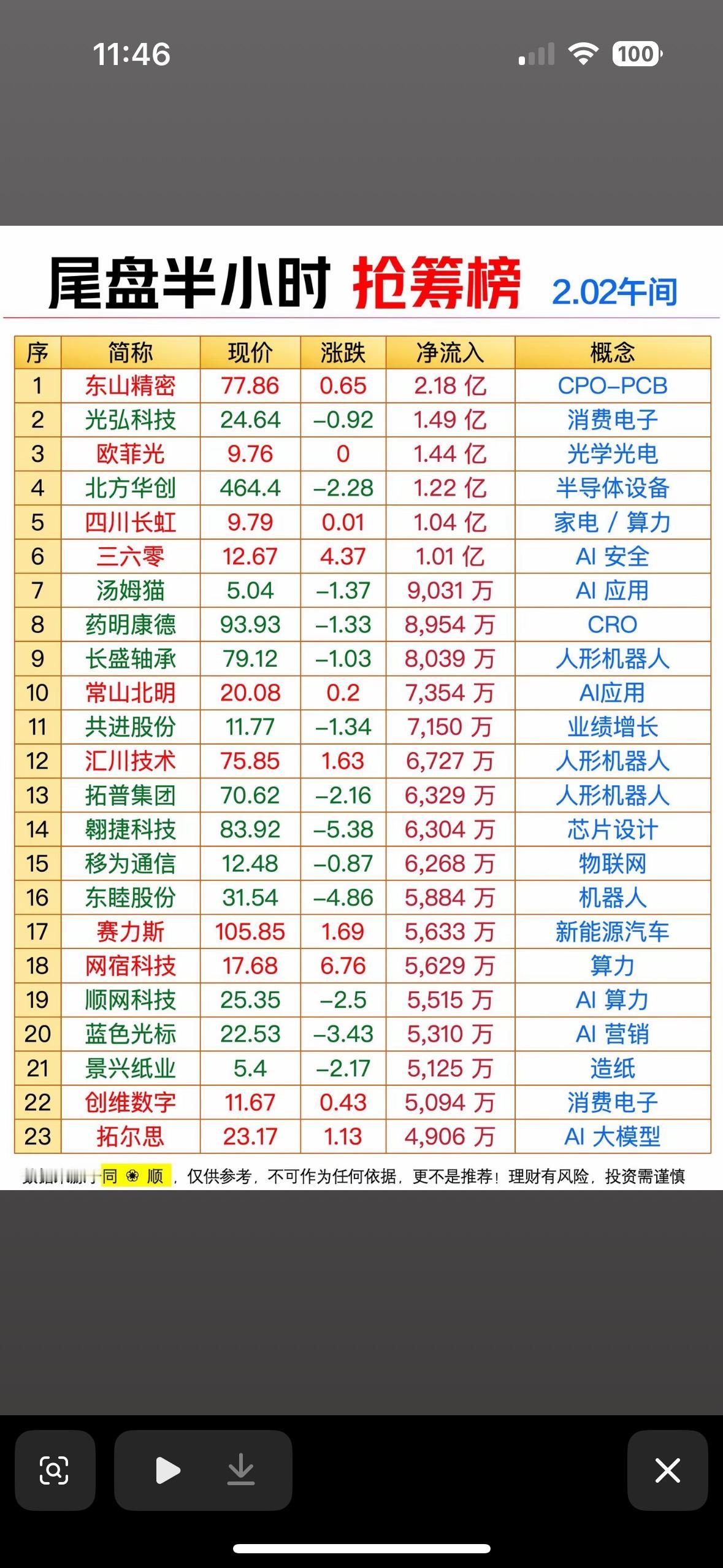 2月2日抢筹榜 揭秘午间市场热点,揭秘涨跌背后的故事!📈📉 "尾盘抢筹榜:东山精密领涨CPO板块,光弘科技消费电子活跃,北方华创半导体承压,三六零AI安全异动,赛力斯新能源车受捧。"
