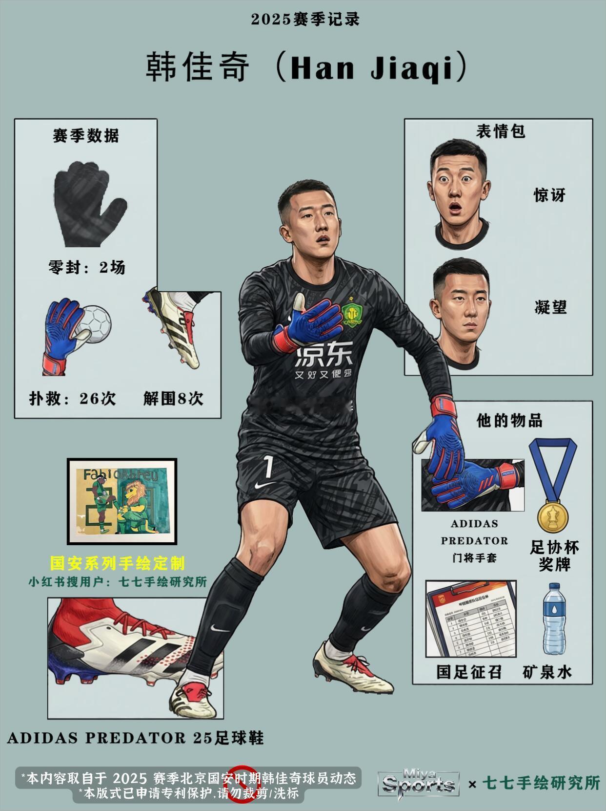 2025赛季的韩佳奇,🥅是比较遗憾的,国安门前那道“站着就带霸气感”的防线,因为伤病这赛季仅2场零封,但26次扑救里藏着不少“极限反应”:飞身扑出近在咫尺的抽射、单掌托出死角吊门,连草皮都被他的扑救姿势蹭出印子,手套上的磨损是他🎰“门线蹲守”的勋章。开局三轮硬仗,他👊用81.25%的扑救成功率稳居联赛榜首,成为中超2/3月最佳门将,更是国安不败战绩的灵魂人物⛳。可剧本总藏着意外,客场比赛,一次扑救后的膝盖重伤,让他的2025赛季提前落幕。🙃刚捧起最佳奖杯的荣光还未散去,便要面对漫长的康复,国安的门线少了他的身影,👀球迷的心里也多了一份牵挂。“佳奇,交给你了!”源自大侯的一句话❤,国安门将的位置,从来不仅是彼此较劲的擂台,而是为了球队并肩的坚守。都是为了让这道国门更稳、更牢。这份竞争,从来都带着温情,无关个人得失,🌹只为国安的荣光。比起其他球队门将位置的冰冷角逐,国安的门线始终藏着独有的人情味。侯森的这一句托付,是前辈对后辈的认可,👊是老将对新星的期许,更是国安门将传承里最动人的大局观,所以小编都希望这些能化作力量,北京的门当然🈶北京人来守护!