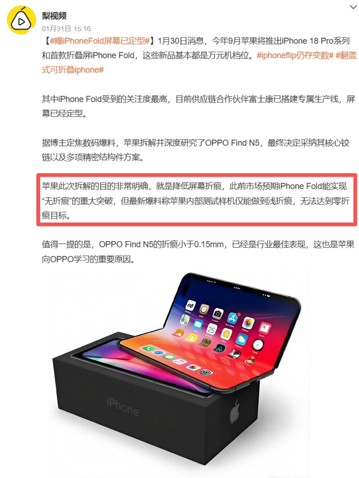 基本确定了,苹果折叠屏屏幕已经定型了 最近的新爆料,iPhone Fold屏幕已经定型了,之前网上各种传的无折痕,其实还做不到,只能做到很浅 而且很离谱的是,苹果是找的OPPO的折叠屏学的,听说苹果要用的屏幕技术也是OPPO的,所以iPhone Fold会跟OPPO的折叠屏高度重合,先发布的OPPO Find N6也会抢先用上新技术 有一说一,OPPO虽然没咋宣传,但技术还是很强的,专利数量一直名列前茅,最近是上人民日报了 不过不管咋说,26年肯定是折叠屏大年了,估计别的厂商也会掏出一些狠货来,大家最期待哪家呢?