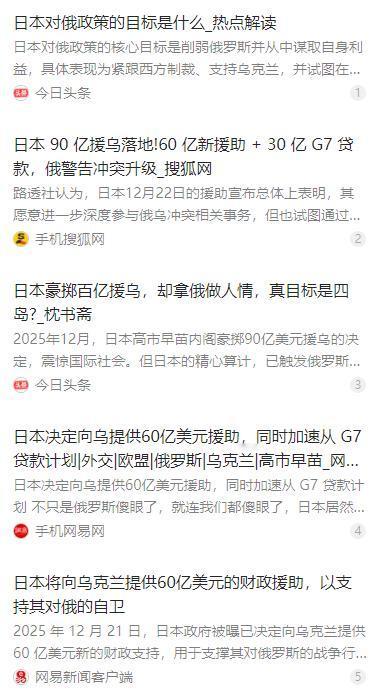 不只是俄罗斯傻眼了,就连我们都傻眼了,日本居然决定向乌克兰提供60亿美元援助,同时加速从G7贷款计划中拨款30亿美元,总计乌克兰将很快收到日本90亿美元援助。 麻烦看官老爷们右上角点击一下“关注”,既方便您进行讨论和分享,又能给您带来不一样的参与感,感谢您的支持! 2025 年 12 月,日本政府正式对外公布对乌追加援助方案,彻底打破此前相对克制的援助尺度。此次新增单独财政支援 60 亿美元,同时加快落实 G7 框架下对乌贷款计划中日本承担的 30 亿美元份额,两项资金合计 90 亿美元,将在短期内分批拨付至乌克兰。 这一规模远超日本过往对乌援助额度,也超出多数国际观察机构的预期,不仅引发俄方强烈不满,也让外界直观感受到日本外交与安全政策的明显转向。 日本此次大额投入并非单纯出于人道主义考量,核心逻辑是紧跟美国对乌战略,通过持续加码援助巩固日美同盟绑定关系,强化自身在 G7 等西方核心机制内的参与度与话语权。 政府希望借深度介入欧洲地缘事务,提升在全球秩序中的定位,摆脱传统经济大国的单一标签,争取更多国际规则制定与议题设置的空间。 这笔援助还承载着多层现实战略算计,日本企业界与政府部门同步对接乌克兰能源、基建、灾后重建等领域需求,提前布局战后市场份额与资源合作通道。 同时,日本借对乌援助向俄罗斯释放强硬信号,试图在南千岛群岛(日称北方四岛)争议问题上施加政治与外交压力,倒逼俄方做出让步。 借助介入俄乌冲突的外部契机,日本同步推进国防预算连续上调、拓展与美军的联合训练与装备协作范围,以 “安全环境恶化” 为说辞推动修宪讨论。 其长期目标是松动和平宪法第九条的约束,逐步突破战后非军事化框架,朝着具备完整战争权与海外用兵权的 “正常国家” 方向调整安保体制。 该政策在日本国内引发明显争议,多家民调显示超六成民众不支持大额援乌,担忧公共财政被过度消耗、国内民生投入被挤压。 民众同时担心对俄强硬姿态会恶化双边经贸与能源合作,加剧东北亚区域安全紧张,进而影响日本自身的稳定发展。 即便面对民间质疑与在野党批评,日本政府仍坚持推进援乌计划,核心诉求是借助重大国际危机提升存在感,重塑自身全球战略角色。 政府将援乌定位为 “维护国际秩序” 的责任行动,试图以此淡化国内争议,为后续安保与外交政策调整积累舆论与政治资本。 从长远影响看,日本此次举动进一步加剧俄乌冲突的持续态势,也让俄日关系降至冷战后低点,双方在争议岛屿、渔业、能源等领域的合作全面停滞。 东北亚地区的安全博弈随之复杂化,地区国家均对日本突破战后框架、加速军事扩张的动向保持高度警惕。