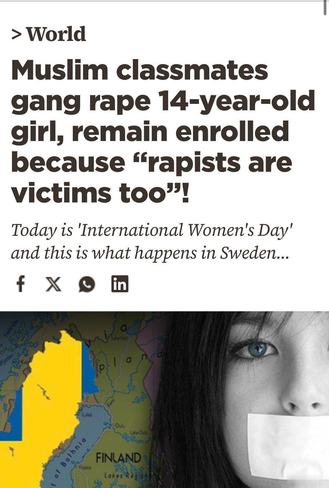 瑞典媒体披露,穆斯林同学轮奸14岁女孩,却仍继续上学,因为“强奸犯也是受害者”!瑞典隆德大学的研究显示,2000年至2024年间,63%的强奸定罪涉及穆斯林移民。瑞典每年记录超过1万起强奸案,穆斯林移民嫌犯比例极高,然而直到现在很多类似案件中依然采取宽大处理,理由多是基于“人道主义”和为了“种族融合”。这就是西方白左的恶心之处,它们对移民的强奸犯罪宽大处理,却能轻易给已婚丈夫扣上“婚内强奸”的罪名。这就是我们的法律学者和专家从瑞典学会来的“文明先进的司法制度”吗?