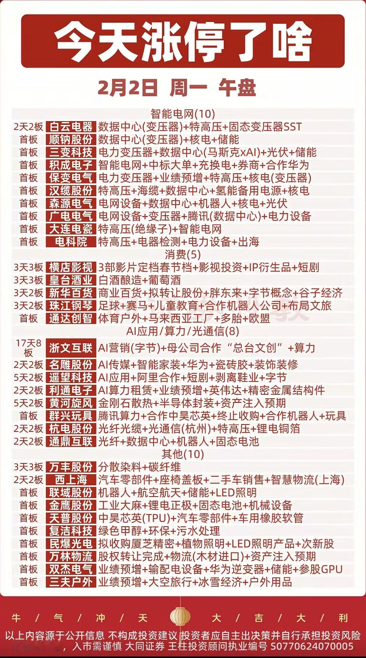 2.2周一 涨停板股票:题材+明细+分布 智能电网 10股涨停 消费 5股涨停 算力光通信 4股涨停 人工智能AI 4股涨停