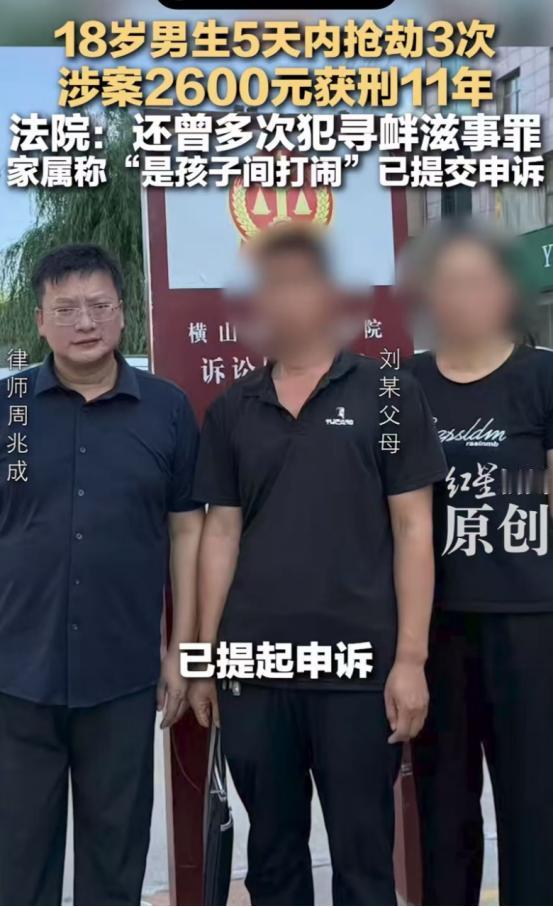 “就抢了2600块,判11年?太重了吧!”陕西,18岁男生抢劫2600块钱,老爸认为这是孩子之间的闹着玩儿,可结果呢,法院给这男生判了11年,那这事儿到底冤不冤呢?   “法官,他只是个孩子啊,你判11年会把他毁了的!”庭审结束那天,刘某的父亲在法院走廊里几乎跪下,声音带着哭腔。可法官并没有因此同情,因为法律面前,18岁早已不是“孩子”,而是要为自己的行为负全责的成年人。   事情还要从2024年6月说起。那时,18岁的刘某刚高考完,他没去放松、没去旅行,而是在短短五天内,三次伙同他人抢劫同学。   第一次,他指使同伴殴打一名男生,逼对方抵押手机换钱;第二次,看到对方发朋友圈晒现金,又带人围堵,强行拿走500元,还逼另一名学生微信转账100元;第三次,他把人带到手机店,硬生生把一部新手机换成旧款,套现差价后自己拿走1000元。   三起案子,总共抢了2600块,但每一次都伴随着拳打脚踢、言语威胁,甚至踩踏和辱骂。这不是一时冲动,更不是“闹着玩”,而是一连串有预谋的暴力勒索。   更让人揪心的是,这并非他第一次惹事。早在2022年起,他就多次参与寻衅滋事:在网吧用灭火器砸人、酒后掐人脖子、对民警出言不逊……这些劣迹都被记录在案。   可他的父母始终觉得,这些不过是“孩子调皮而已”,从未真正管教。然而这一次,法律终究替刘某的父母好好管教了一番。   法庭上,刘某依然避重就轻,对关键情节含糊其辞;而他的父亲则也是反复强调:“他才刚成年”“钱都退了,人家也原谅了”。   但法律看的不是退没退钱,而是行为本身是否构成犯罪。刘某两年内抢劫三次即属“多次抢劫”,属于加重情节,最低刑期就是十年。法院最终判他抢劫罪10年、寻衅滋事罪2年,合并执行11年,其实已经考虑了他刚成年、部分退赔等从轻因素。   判决一出,也引起了铺天盖地的讨论。有人认为这样的处罚过重,11年的刑期很有可能毁了这个孩子的未来;但更多的人则理性看待,认为刘某不是初犯,并且屡教不改,而且他的家庭教育也存在很大问题,确实需要法律好好约束。   其实,这起案件最值得我们深思的,不是刑期的长短,而是家庭教育的彻底失守。当父母把暴力当成调皮,把勒索当作玩笑,孩子自然分不清对错。直到铁窗落下,刘某终究用11年的青春为自己的无知买单。   说到底,法律不会因为一句“他还是个孩子”就网开一面,真正的保护,是在孩子第一次伸手越界时,就坚定地说“不行”。否则,今天你纵容的“小错”,明天就可能变成无法挽回的大祸。   对此你有什么看法?欢迎在评论区留言讨论。法律 家庭教育   信息来源: 红星新闻 文|墨海 编辑|史叔