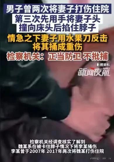 “干得漂亮!”湖北,因为琐事,丈夫和妻子吵了起来,丈夫一个不开心,把家具砸得稀巴烂,这还不解气,他一把将妻子的头撞向床头,双手紧掐着妻子的脖子,妻子呼吸不过来,摸到一把水果刀,就刺向丈夫,她得救了,丈夫重伤二级,事情的结果,让人大快人心。 魏女士被丈夫一把推向床头,他用右手把魏女士的头不停撞向床头,这还不解气,他又用双手掐住魏女士的脖子。 魏女士呼吸不过来,这一刻她害怕了,她也猛然觉悟了,再这样下去,她小命不保,这一刻,往事的一幕幕涌现在眼前,她知道如果自己再不反抗,就要领盒饭了。 她看着眼前的丈夫,如恶魔一般,正在一步步地剥夺她的生命,她恐惧,她害怕。 她的这个丈夫,真的让她感到非常痛苦,她被打已经不是一次两次的事情了,丈夫脾气暴躁,也不是突然间的,他就是这么让人恐惧。 早在2007年,魏女士就被丈夫殴打住进了医院,那时她看在丈夫初犯的份上,想着给孩子一个完整的家,想着两人还有感情,想着自己忍一忍,日子就能过下去。 当第1次的家暴,伤口愈合,她也就忘记了这件事给自己带来的伤害,她原谅了丈夫。 可家暴这件事,有了第1次就会有无数次,在2017年,丈夫变本加厉的家暴,又一次将她打进医院,这一次她身心受伤害,终于明白,丈夫真不是偶然地打她,她开始害怕恐惧。 就在这样的害怕恐惧中,她只能继续和丈夫生活着,害怕丈夫会继续地伤害她。 她一忍再忍,但丈夫依然没有好好地对她。 这一次的家暴开始了,事情发生在2025年3月份,当时夫妻俩因为一些琐事又争吵起来,毕竟夫妻之间,时常会有矛盾。 他们俩有矛盾,有争执,丈夫习惯地打砸家具,看到眼前一地的狼藉,魏女士只好忍气吞声,想着再忍一忍就风平浪静了。 结果没想到,丈夫居然要掐住她的脖子,要她的命,此刻她很清楚,要想活下去,就得反抗。 她已经两次被打进医院了,丈夫这一次不可能会手下留情,但凡丈夫再用力一点,她可能就看不到美好的世界了。 她用力地想呼吸,可丈夫紧紧地掐住她的脖子,气根本上不来,她似乎感觉到自己就要死去了。 她的手不停地扑腾着,突然,她摸到了一把水果刀,此时她不能有半点犹豫,这是救自己的唯一机会。 水果刀刺向丈夫的这一刻,丈夫的手松开了,她呼吸过来了,仿佛重生了一般。 看着眼前的丈夫倒在血泊中,她又感到很害怕,就赶紧送丈夫去就医,但丈夫还是重伤二级。 发生这样的事情,重获新生的魏女士却非常害怕,害怕自己要为自己的行为承担责任,会受到刑事处罚。 她忐忑不安,她不后悔把丈夫弄成轻伤二级,她是在救自己的命,她恐惧的是,她害怕自己因为这件事,要受到法律的制裁。 但事情的结局却让她感到意外,她的行为竟然被认定为正当防卫行为。 为何她的行为会被如此认定呢? 在这件事情中,魏女士是在被掐住脖子的情况下,呼吸不过来,很有可能失去生命,在生命受到威胁时,她才伤害到自己的丈夫,在当时的情况下,她的行为是情有可原的,是保护自己的行为,符合正当防卫的认定。 《刑法》第20条规定:为了本人的人身、财产和其他权利免受正在进行的不法侵害,而采取的制止不法侵害的行为,对不法侵害人造成损害的,属于正当防卫,不负刑事责任。 既然她的行为被认定为正当防卫行为,她当然不用受到任何处罚。 这个结果让人大快人心! 丈夫家暴妻子,这本来就是不可容忍的一件事情,遇到这种事情,不但勇敢地要说不,还要勇敢地反抗,才能保护自己。 那么你对这件事有何看法呢?