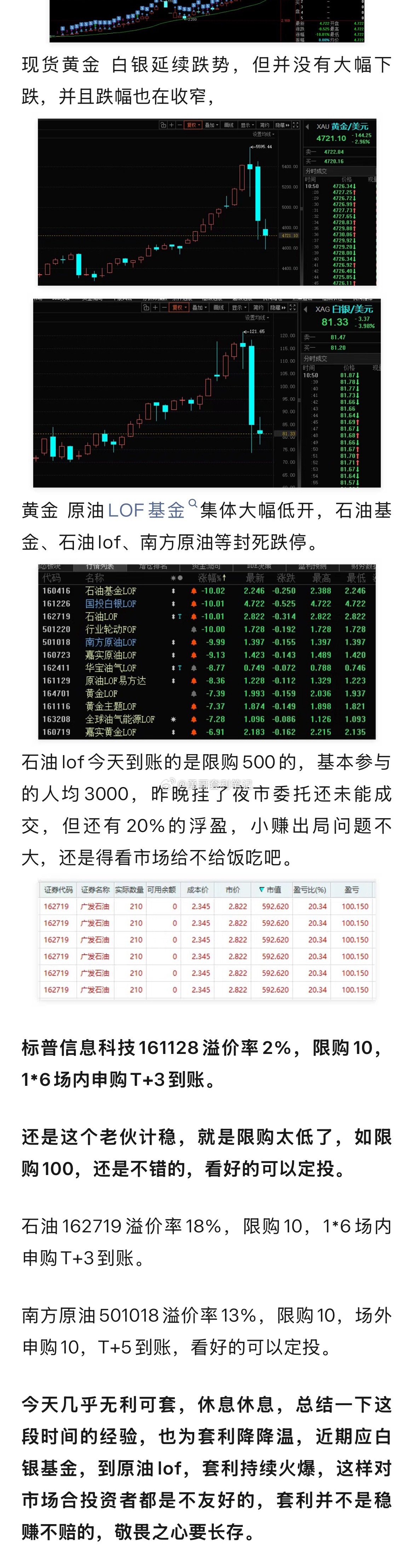 今天几乎无利可套,休息休息,总结一下这段时间的经验,也为套利降降温,近期应白银基金,到原油lof,套利持续火爆,这样对市场合投资者都是不友好的,套利并不是稳赚不赔的,敬畏之心要长存。免责声明:数据仅供参考,具体以基金公司公告为准!风险提示:市场有风险,投资需谨慎。文中标的不做任何买卖建议及操作指引,投资者应自主做出决策并承担相应投资风险!基金