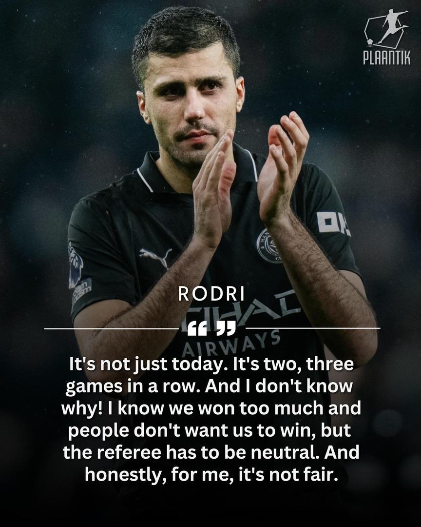 【罗德里炮轰:外界不想曼城赢】曼城客场2-2战平热刺的赛后,关于索兰克的第一粒进球,罗德里毫不避讳,直接质疑了英超裁判的公平性! “这不只是今天才出现的问题,而是连续两、三场比赛都这样了。我实在想不通为什么!我知道我们赢了太多,大家都不想再看到我们赢球😳,但裁判必须保持中立。说实话,对我来说,这太不公平了。” “我们满心沮丧,因为这次犯规再明显不过了,他就是踢到了腿。我们必须正视这些小细节,否则联赛的比赛都会变得难以开展,毕竟英超的输赢本就系于这些细微的地方。” “这场结果算不上致命打击。我们本希望能在客场全取三分,但即便如此,我们也不会垂头丧气,而是会继续拼到最后,这就是我们球队的精神内核。” “但比赛的判罚必须保持公平,一次误判尚可理解,毕竟人都会犯错,可一而再、再而三出现这样的情况,这就说不过去了。” “我并不是说英超裁判的执法水平不行,他们的表现整体上很出色,但我们必须重视这些判罚细节。我们为比赛拼尽全力,可这些细微的判罚失误却左右了比赛结果——这本不该发生,但遗憾的是,今天它真实上演了。”曼城