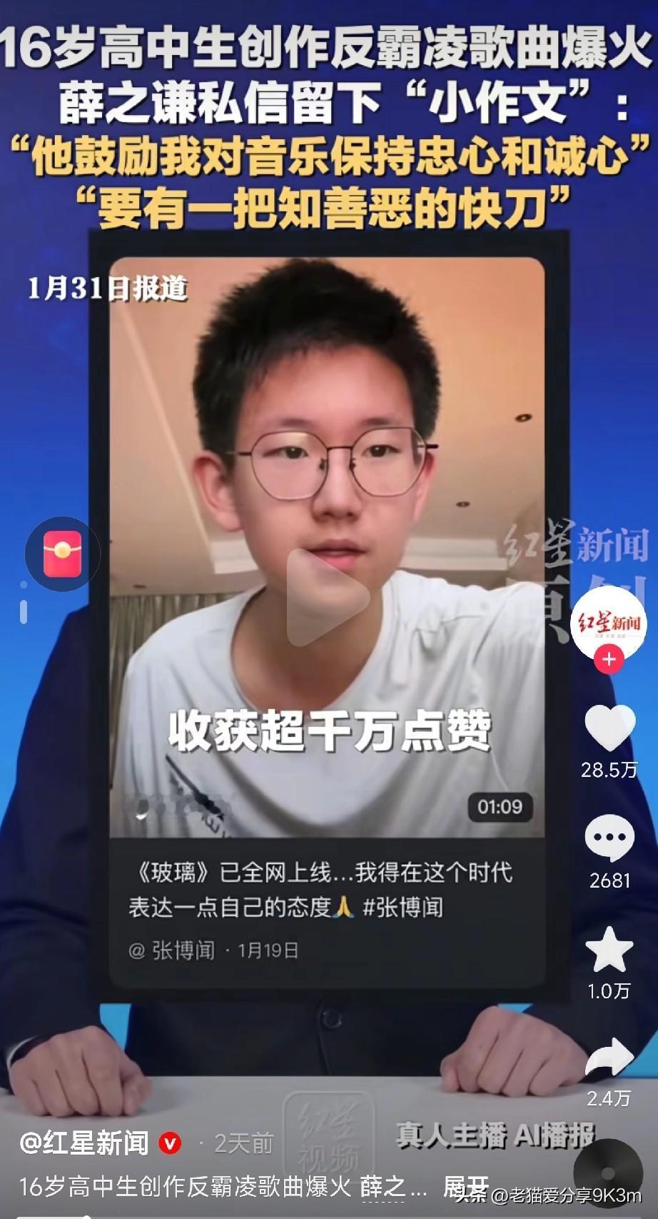 北京高二学生张博文,一个16岁的少年,自己作词作曲写了一首反霸凌歌曲《玻璃》,直接火出圈! 播放量破亿,点赞超千万! 更牛的是,薛之谦亲自私信鼓励,还写小作文打call:“保持忠心诚心,音乐路上别怂!” 这歌为啥这么狠?歌词句句扎心,直戳霸凌痛点!“面孔由众人决策,心脏被戳了再戳”、“表面沉默万箭穿过玻璃”……用“玻璃”隐喻受害者:看似坚硬,实则一碰就碎。 听完评论区直接炸锅,无数网友哭着倾诉自己被霸凌的经历。有网友说:“这歌像刀子,剖开了我封存的青春伤口。” 但最让我服的,是张博文的父亲张占军!面对爆火,人家清醒得一批: “这歌能火,90%是运气。我不希望他爆红,怕他被流量反噬啊!” 这话说得太对!现在多少网红被流量捧杀?这爹太拎得清,知道自己孩子该走什么路。 张博文拒绝音乐公司收购,坚持全平台免费。他说:“这歌是求救信号,不是赚钱工具。” 薛之谦的格局:大佬没蹭热度,是真被触动。私信里那句“要有一把知善恶的快刀”,既夸才华,又教做人。 父亲的远见:不消费孩子流量,反而担忧“反噬”。这种保护,比追着孩子开直播的家长强100倍! 说真的,现在全网吹“少年天才”,但张爸的清醒才是真宝藏。 流量是把双刃剑,多少人一夜爆红后跌落神坛?能沉住气,守住本心,才是真本事。 最后必须夸夸这娃!16岁就用音乐当武器,为沉默者发声。 希望更多孩子敢对霸凌说“不”,也希望每个创作者都有这样的清醒和底气。 (文章素材来自红星新闻,侵删)