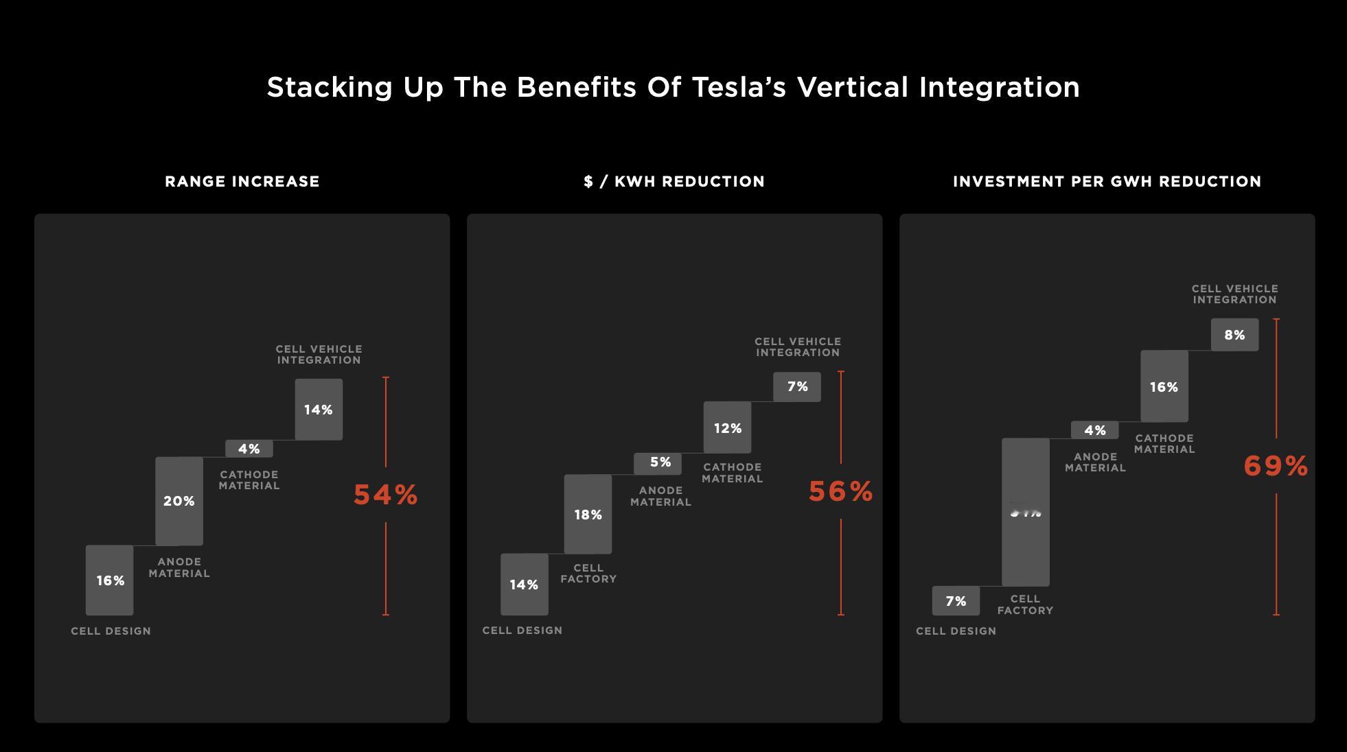 再加上其他诸如材料、电芯设计等垂直整合的优化,特斯拉希望 4680 电池实现续航增加 54%,成本下降 56%,单位成本投资下降 69%。