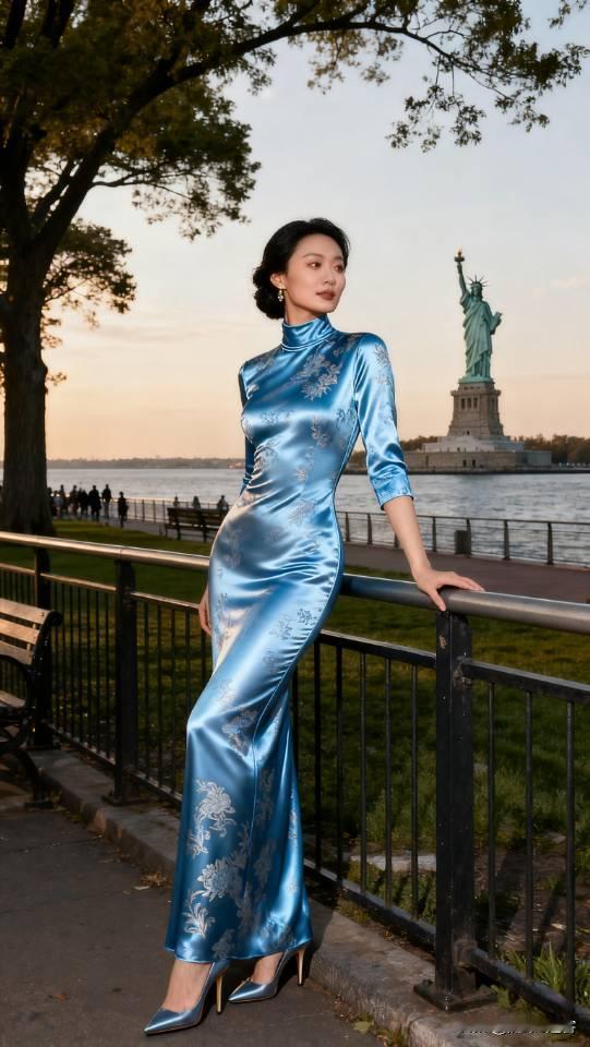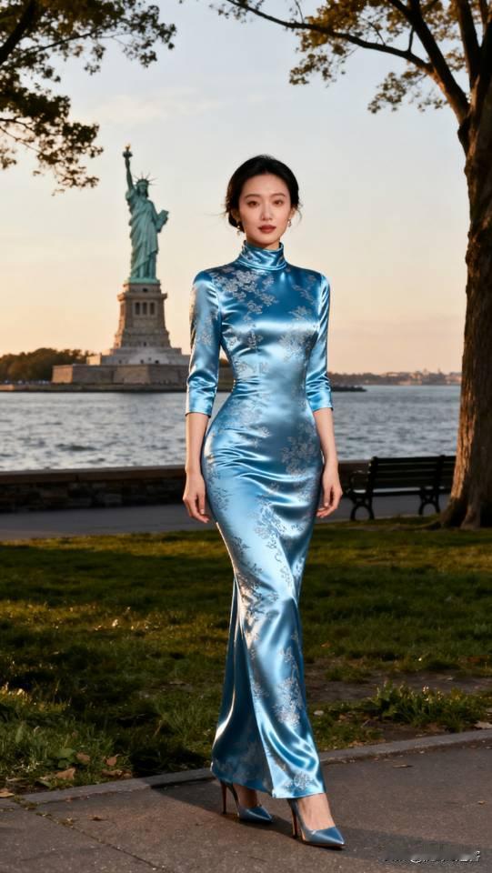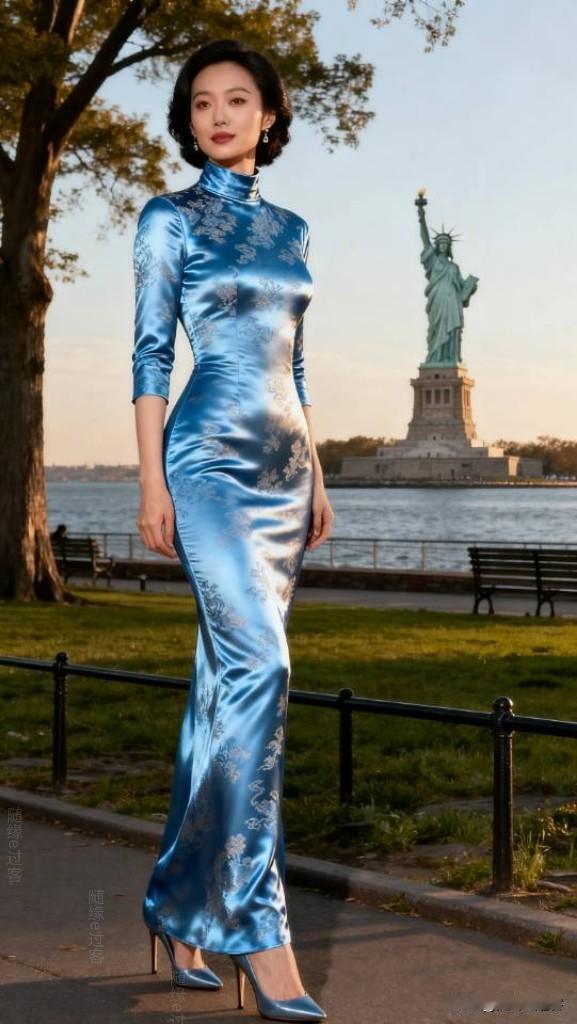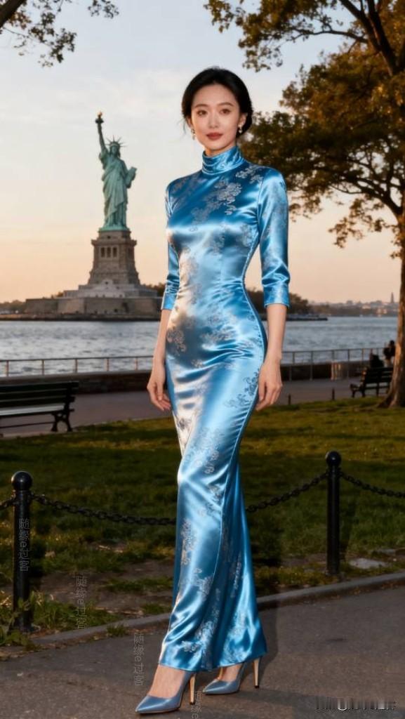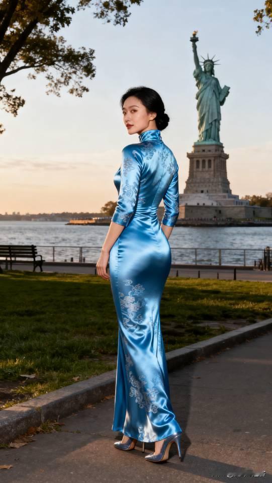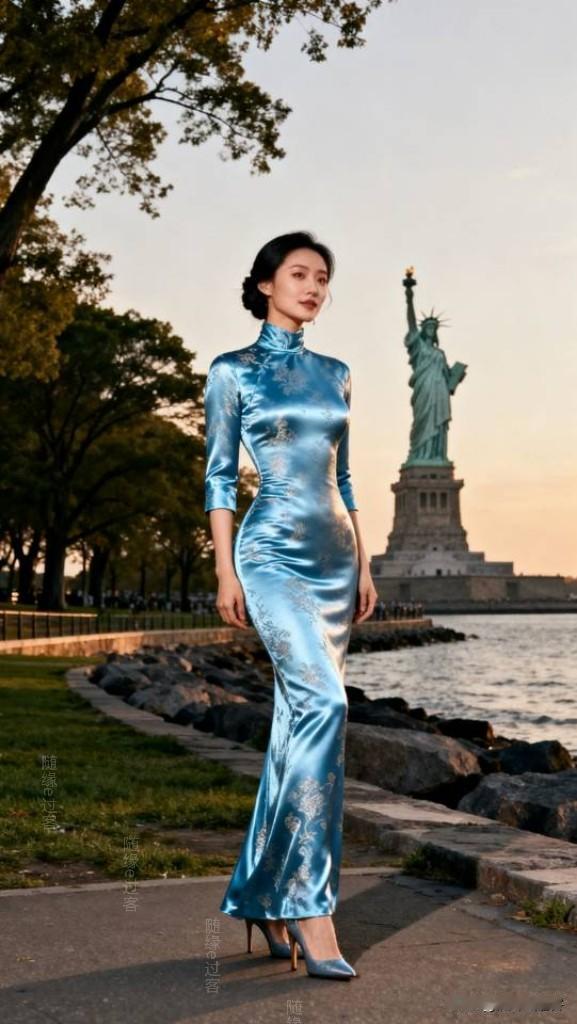 记录我的2026身穿蓝色旗袍裙女子在美国景点留影。旗袍 旗袍裙 旗袍美女