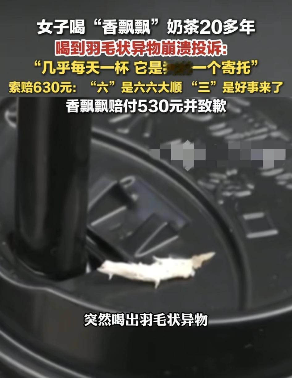 宁波慈溪一女子喝香飘飘奶茶20多年,每天几乎一杯。在超市里买了10来杯的奶茶中,其中一杯抹茶奶绿中喝出了羽毛状的异物,当时感觉到特别的恶心。毕竟女子认为这是已经是她的一种精神寄托,跟商家索赔630元图个吉利,经过双方的协商,最终对方赔偿530元并道歉。很多人说喝20年的奶茶身体如果还健康的话,那么就代表着身体真的很能扛,同时也代表着这些生产流水线还是有一定的概率事件。