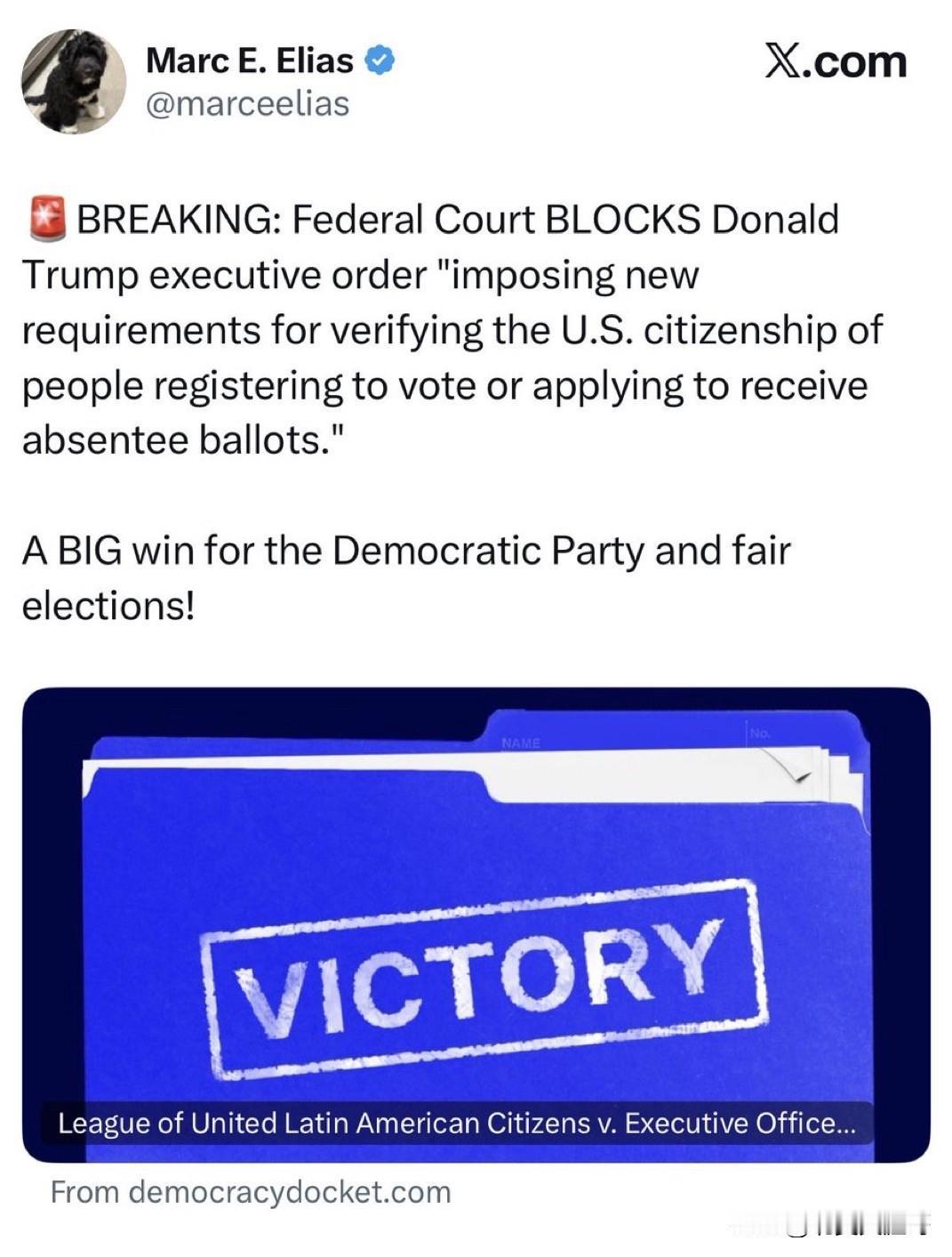 突发新闻!联邦法院阻止投票检验身份 美国联邦法院(华盛顿特区联邦地区法院法官Colleen Kollar-Kotelly)于昨天做出裁决,永久阻止特朗普总统去年签署的一项行政命令中要求在选民登记或申请邮寄选票时强制提供公民身份证明的关键条款。 这次民主党也不装了,直接亮剑,这对特朗普政府来说是又一重大挫败(该命令多条已被法院叫停)。目前联邦层面仍无全国统一强制“投票验身份”要求,特朗普阵营可能上诉或推动国会立法。