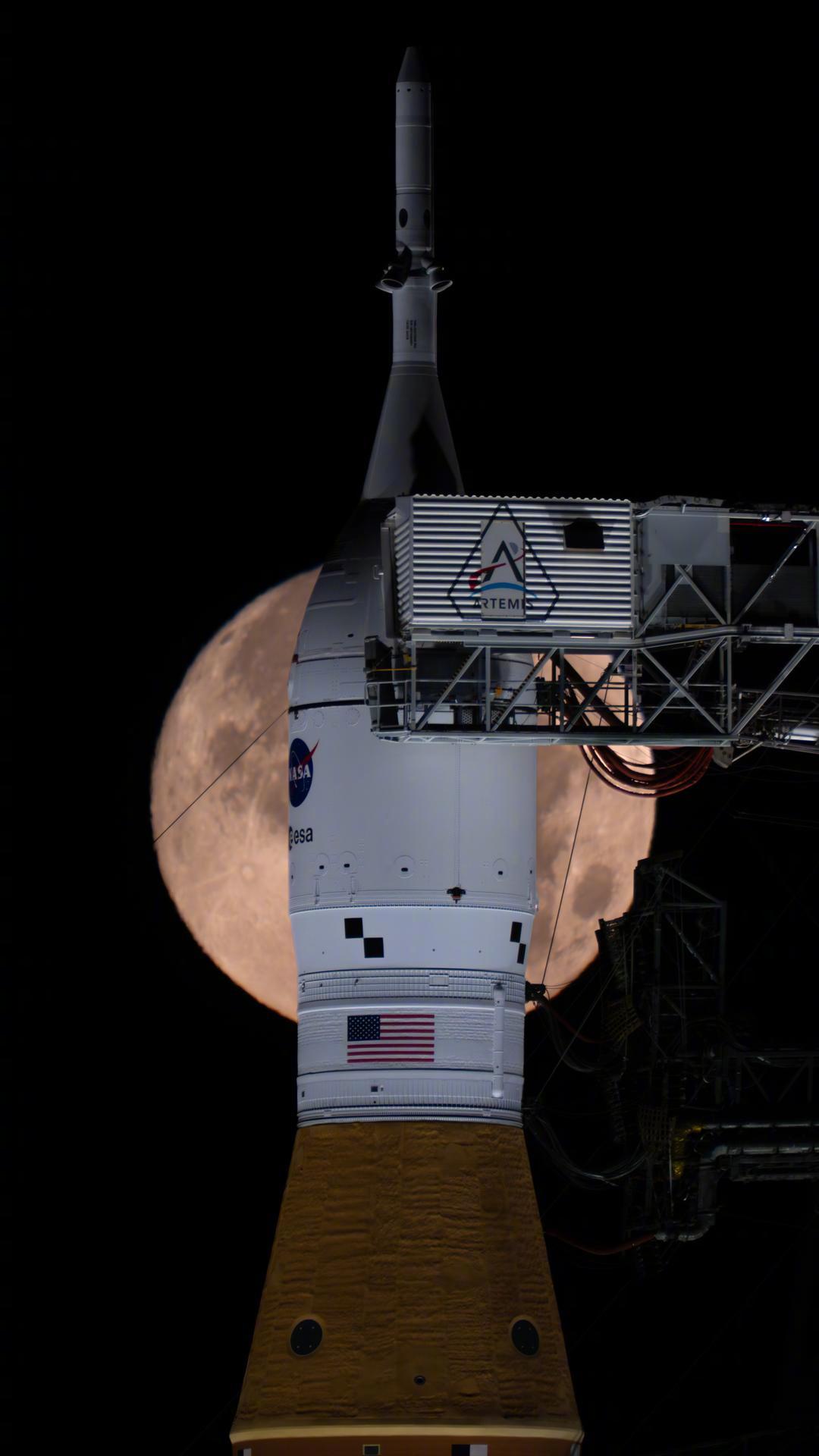 月光之下,被聚光灯照得雪亮的SLS火箭和顶端的猎户座飞船伫立在那里,准备接受一场被称为“湿彩排”的严酷大考。