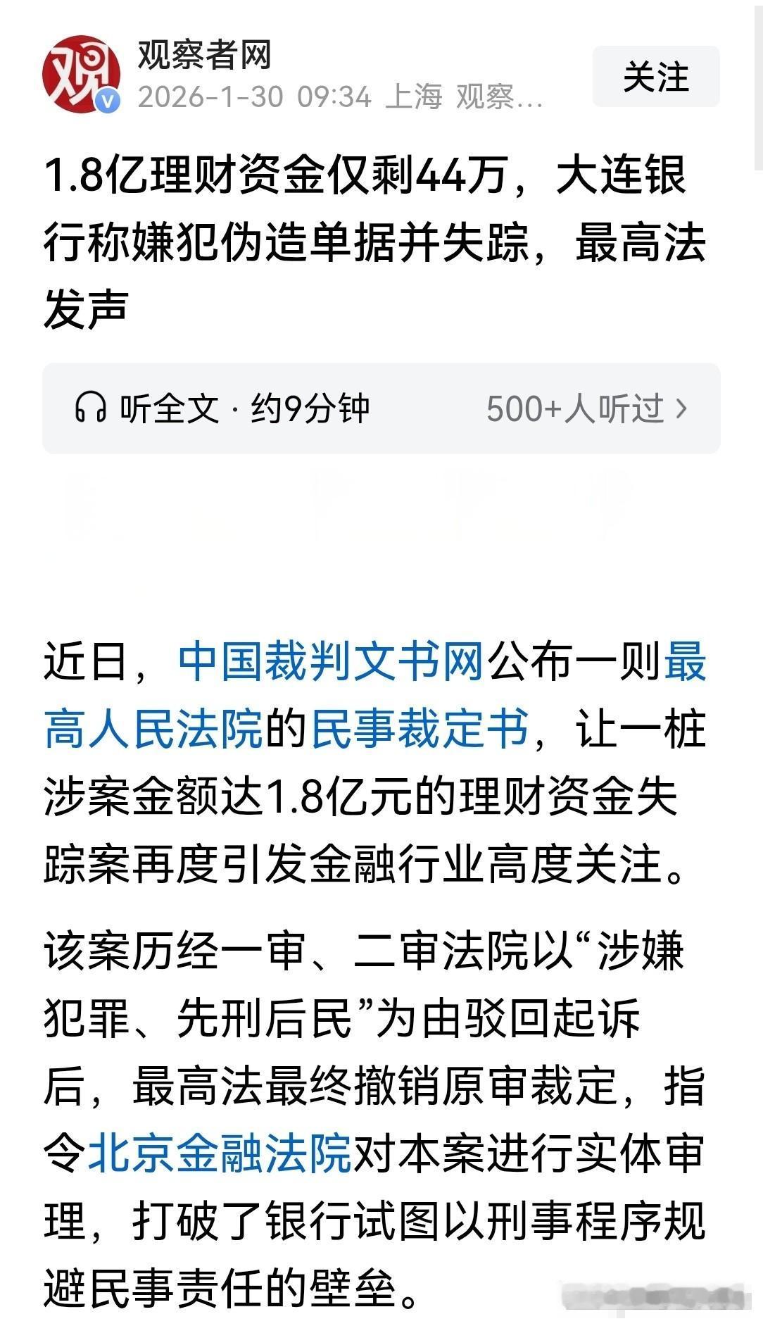 离了个天的大谱!北京,某公证处在银行存了1.8亿,需要用钱时才发现,账户内1.8亿的本息,仅剩44万。蹊跷的是,5年来,银行对账单显示正常。经查,资金早就被转移了,尽管所有证据都摆在面前,银行却不承认,甚至甩锅涉案职员:已精神失常,且早已失踪,客户经理已离职。公证处告上法庭,一审、二审被驳回,1.8亿资金无处追讨。   2018年6月,这家公证处和大连银行的一家分行签了协议,把1.8亿投成了银行的理财产品,谁能想到这竟是个大坑。 接下来的五年,银行客户经理还挺“负责”,定期上门送对账单,上面的金额、利息都对得上,公章也清清楚楚,公证处压根没往坏处想。 直到产品到期要用钱,工作人员去银行办理兑付,才被当头一棒——钱没了,就剩44万余元躺在账户里,1.8亿的本息几乎全“蒸发”了。   公证处赶紧找银行要说法,可银行的态度简直荒唐透顶。面对摆在眼前的转账记录、虚假单据这些证据,银行愣是不承认有责任,张嘴就甩锅:涉案的职员早就精神失常跑没影了,当初对接的客户经理也离职了,这事跟银行没关系。 这话说出来谁信啊?钱是存在你银行的,盖着你银行公章的对账单是假的,内部职员能随便转走上亿资金,这分明是银行自己监管出了大漏洞,倒好,一句“人跑了”就想脱干净干系?   被逼无奈,公证处只能告上法庭,可更让人寒心的还在后面。一审、二审法院都驳回了起诉,理由是“涉嫌犯罪、先刑后民”,意思是得先把刑事案子查清楚,再处理民事赔偿。 这看似合规的说法,其实就是把公证处往死路上逼。刑事案子查个三年五载太常见,等查完银行说不定早有别的说法,就算赢了官司,钱能不能拿回来都是未知数,这不就是变相给银行拖延时间吗?   好在公证处没放弃,硬生生把官司打到了最高法,这才终于看到了希望。最高法直接撤销了之前的裁定,指令北京金融法院重新审理,真相也算彻底露了面。 原来银行拿“先刑后民”当挡箭牌根本站不住脚,民事纠纷说的是公证处和银行之间的存钱合同有没有履行好,刑事犯罪查的是有人伪造单据、偷转资金,这压根不是一回事,不能因为有人犯罪就拖着不解决银行的责任问题。   说句实在的,这事里银行的操作太让人失望了。作为管钱的专业机构,本该是资金最安全的“保险箱”,结果却成了漏洞百出的“筛子”。 上亿资金被转走五年都没发现,假对账单能盖着公章流通,这说明银行内部的审核、监管全是摆设。出事后不想着怎么补救,反而先想着把责任推给失踪的职员,这哪是负责任的态度? 央行和银监会早就说过,银行有义务保护存款人的合法权益,可这家银行倒好,把义务抛到九霄云外,满脑子都是怎么甩锅。   更可气的是“先刑后民”这个借口被滥用。本来这个原则是为了查清事实,结果反倒成了银行拖延责任的工具。 储户把钱存在银行,凭的是信任,现在钱没了,还要被法律程序拖着来回跑,一二审法院不分青红皂白就驳回起诉,根本没考虑储户的难处。幸好最高法明察秋毫,戳破了这个幌子,不然这1.8亿真可能就石沉大海了。   这种事说白了,就是银行内控出了大问题,又不想承担后果。这些年类似的存款失踪案也不是第一次了,大多都是银行“内鬼”勾结外人,利用监管漏洞作案,出事后银行就想把责任推给个人。 可钱是存在银行的,合同是跟银行签的,就算有职员犯罪,也是银行没管好自己人、没守好资金大门,凭什么让储户承担损失?   最高法这次的裁定算是给所有银行敲了警钟:别再拿“先刑后民”当挡箭牌,储户的钱不是大风刮来的,银行必须负起责任。 也该让这些银行好好反思反思,与其花心思找借口甩锅,不如把内部监管的漏洞补上,别再让老百姓的血汗钱白白打了水漂。
