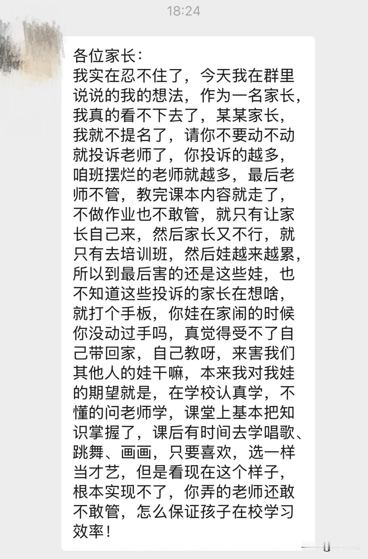“怒了!”网传一张班级群聊天截图,有家长忍不住在群里发声,怒斥某位家长动不动就投诉老师,直言这种行为只会逼得老师“摆烂”,最后遭殃的还是班里的孩子。打个手板要投诉,布置点作业也要投诉,搞得老师现在教完课本内容就走,不敢管纪律、不敢留作业。甚至直言受不了就带回家,自己教啊! 这事在网上流传开来,网友也纷纷吐槽:“现在的老师太难了,管严一点就被投诉,不管又被说不负责任”! 还有网友甚至坦言:“投诉的家长倒是痛快了,其他孩子的学习谁来负责?” 在周少看来,老师的管教,本就是课堂秩序的保障。那些动辄投诉的家长,在家孩子闹脾气时未必没动过手,到了学校却对老师的管教百般挑剔。 可见,过度投诉只会让老师束手束脚,不敢管、不愿管。最后课堂效率直线下降,孩子在校学不到东西,家长只能花钱送培训班,娃学得累,家长也折腾。 咱们送孩子去学校,图的就是老师能尽心教导,让孩子在课堂掌握知识,课后有时间发展唱歌、跳舞这类才艺。可现在这个局面,这样的期望怕是很难实现了。 对于,各位家长还是积点德,多互相理解和体贴,别动不动就投诉老师,最后只会两败俱伤,受伤的只有孩子。#寻美三湘# #长沙新朋友#
