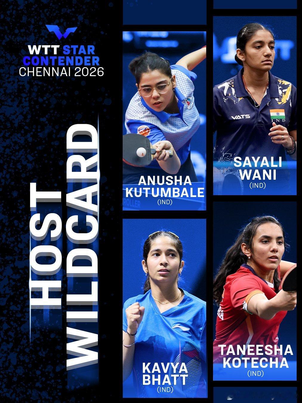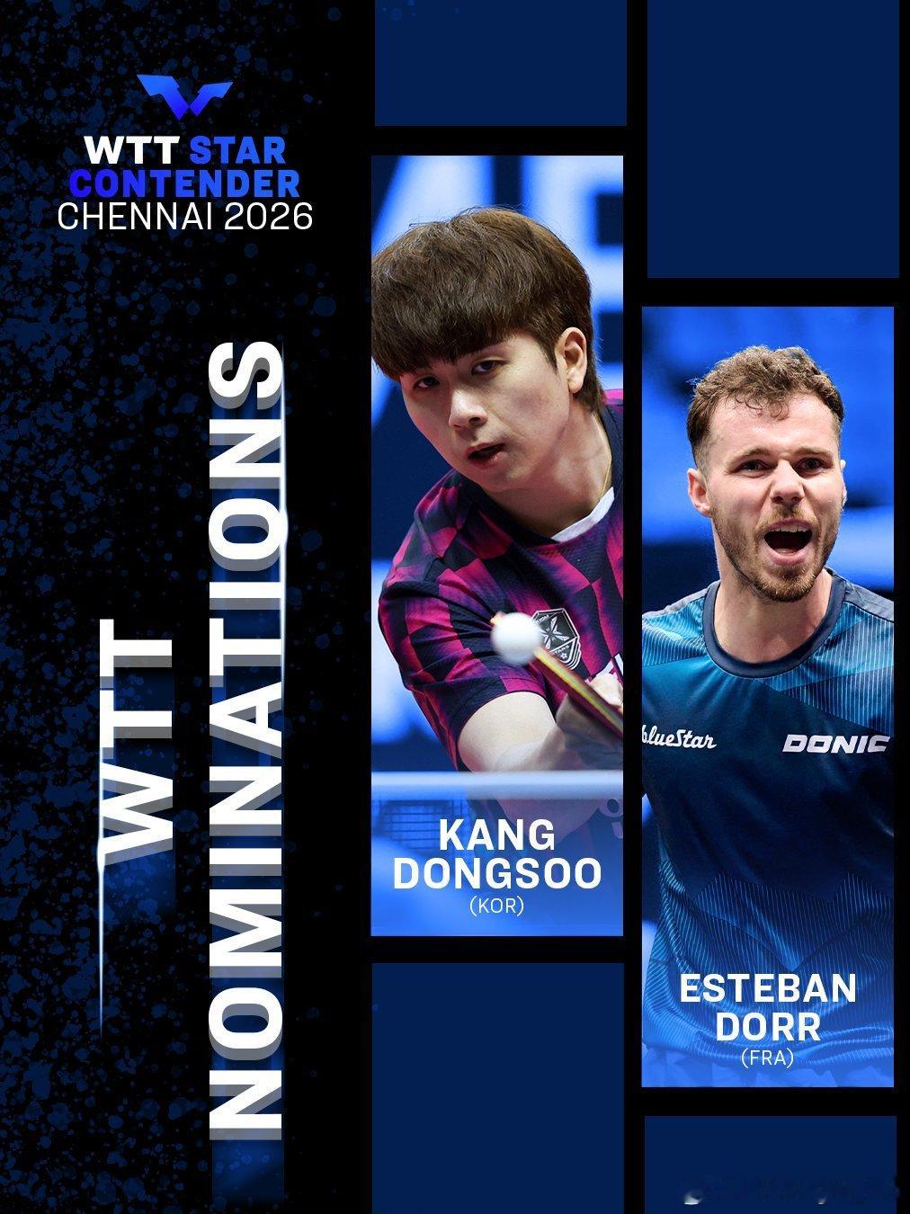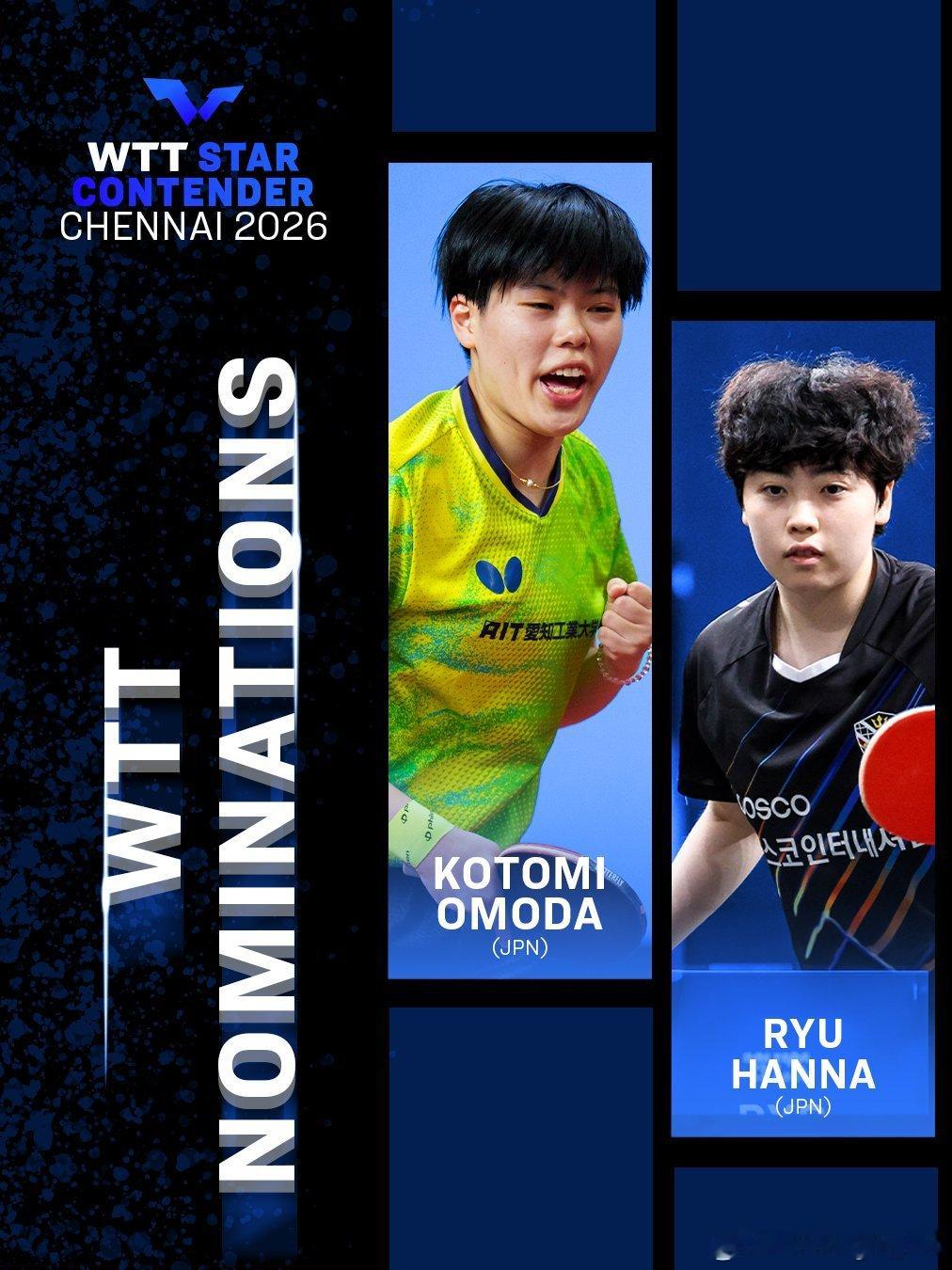 WTT球星挑战赛金奈站2026WTT提名女单:面田采巳🇯🇵、柳韩娜🇰🇷(wtt图片标错国籍)男单:姜东硕🇰🇷、埃斯特班·多尔🇫🇷青少年提名:迪维扬希·博米克🇮🇳、阿比南德·普拉迪瓦迪🇮🇳